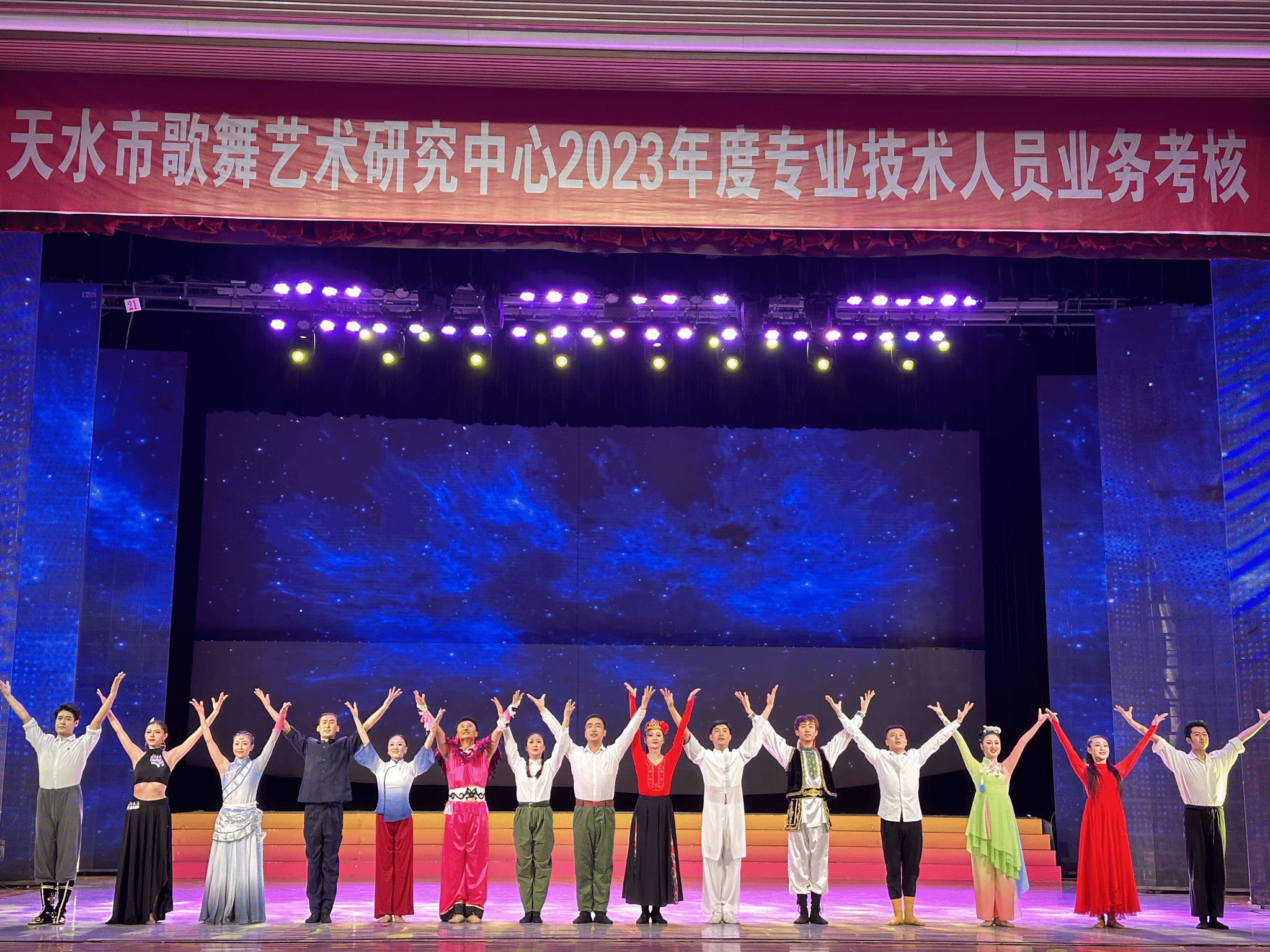 本次考核从基本功、专业技巧展示、道德品行等多方面对专业技术人员的专业素养进行了考核。我中心设有器乐队、演员队、舞蹈队、声乐队和舞美队,艺术门类丰富。11月2日早上9点,考核准时在秦州大剧院开始,考核内容丰富多彩,有民族古典舞、民间舞、现代舞、小提琴、琵琶独奏、歌曲演唱、歌剧片段表演、小品、相声表演等。这些充分展示了天水市歌舞艺术研究中心专业技术人员扎实深厚的功底、较强的表演能力和演员的一专多能。