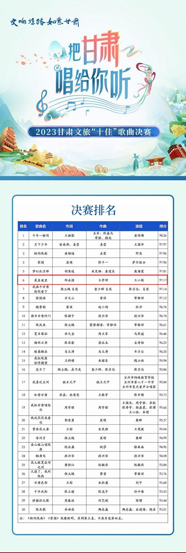我市原创歌曲《羲皇故里》斩获 “把甘肃唱给你听”2023甘肃文旅“十佳”歌曲殊荣。本次歌曲大赛是甘肃历史上参赛规模最大、参赛范围最广、参赛歌曲质量最好、影响力最大的专业音乐赛事活动。