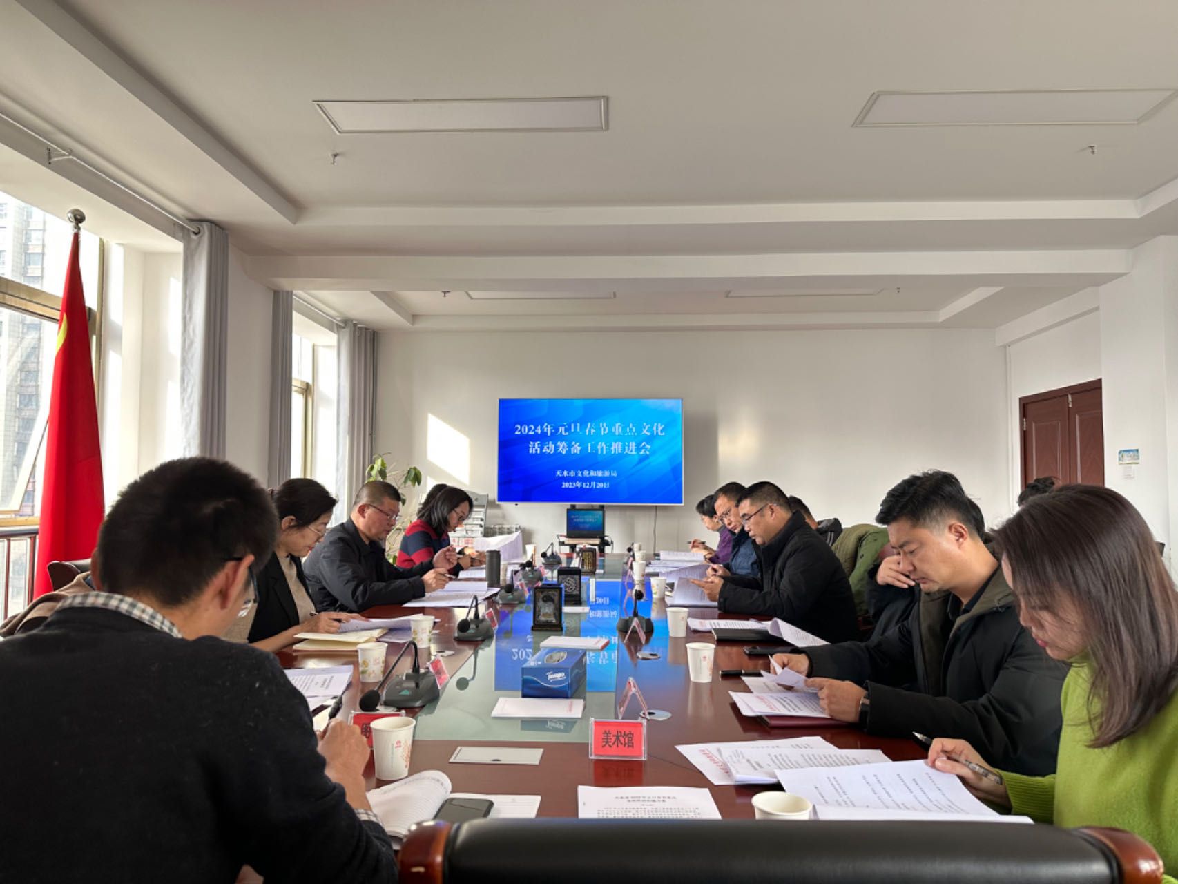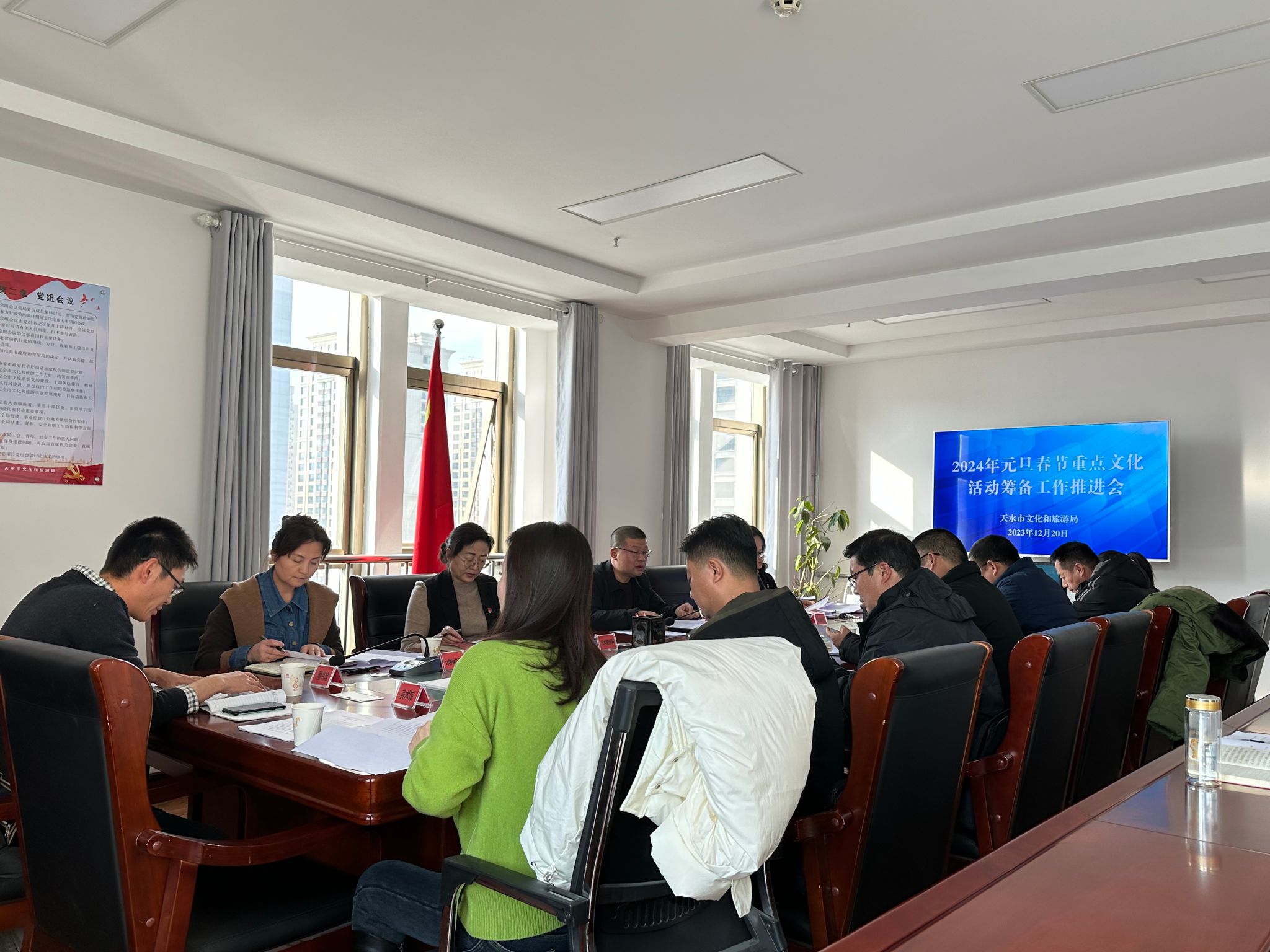 12月20日,天水市文化和旅游局组织召开了2024年元旦春节重点文化活动筹备进展情况推进会,市文化和旅游局党组成员、副局长李星杰主持会议。秦州区文体广电和旅游局、麦积区文体广电和旅游局、市文化馆、市歌舞艺术研究中心、市西秦腔研究院、市博物馆、天水美术馆、市图书馆及相关科室负责人参加了会议。会上,对《天水市2024年元旦春节重点文化活动实施方案》进行了讨论,各活动承办单位就各自承担的元旦春节重点文化活动筹备进展情况作了汇报。