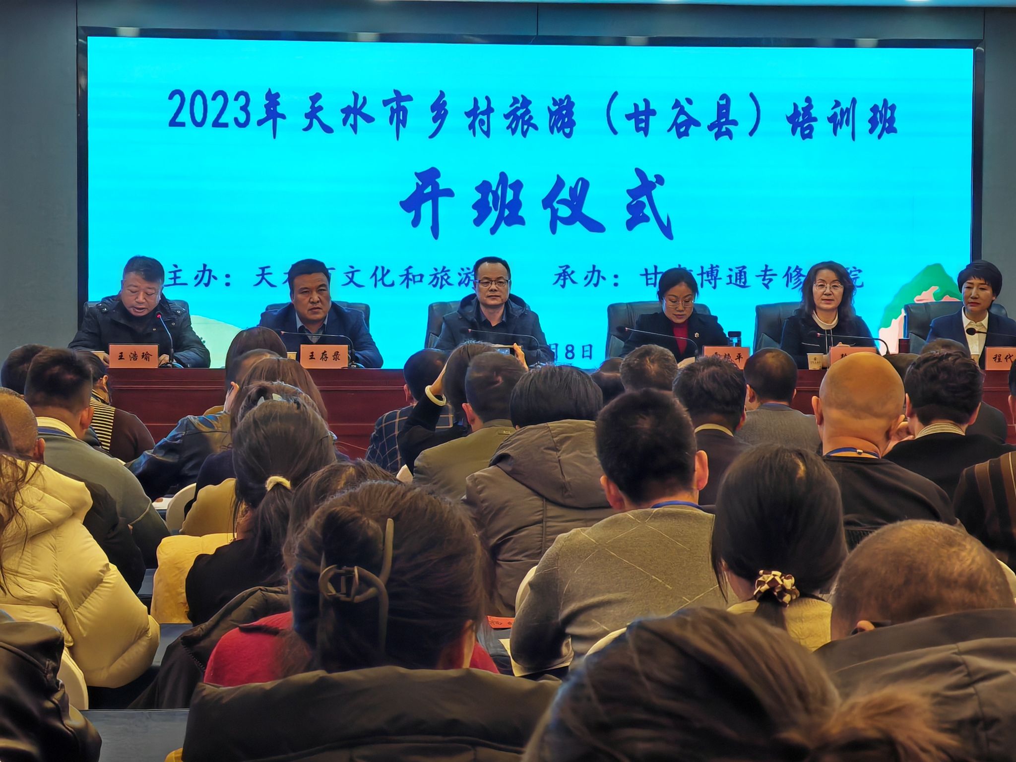 1月8日,2023年天水市乡村旅游培训班(第二期)在甘谷县开班,各县区文旅部门相关负责人、乡村旅游业务骨干以及乡村旅游重点乡镇负责人、乡村旅游重点村干部、乡村旅游经营管理人员等150人参加培训。天水市文化和旅游局党组成员、副局长裴康吉出席开班仪式并讲话,甘谷县副县长霍艳平为开班仪式致辞。