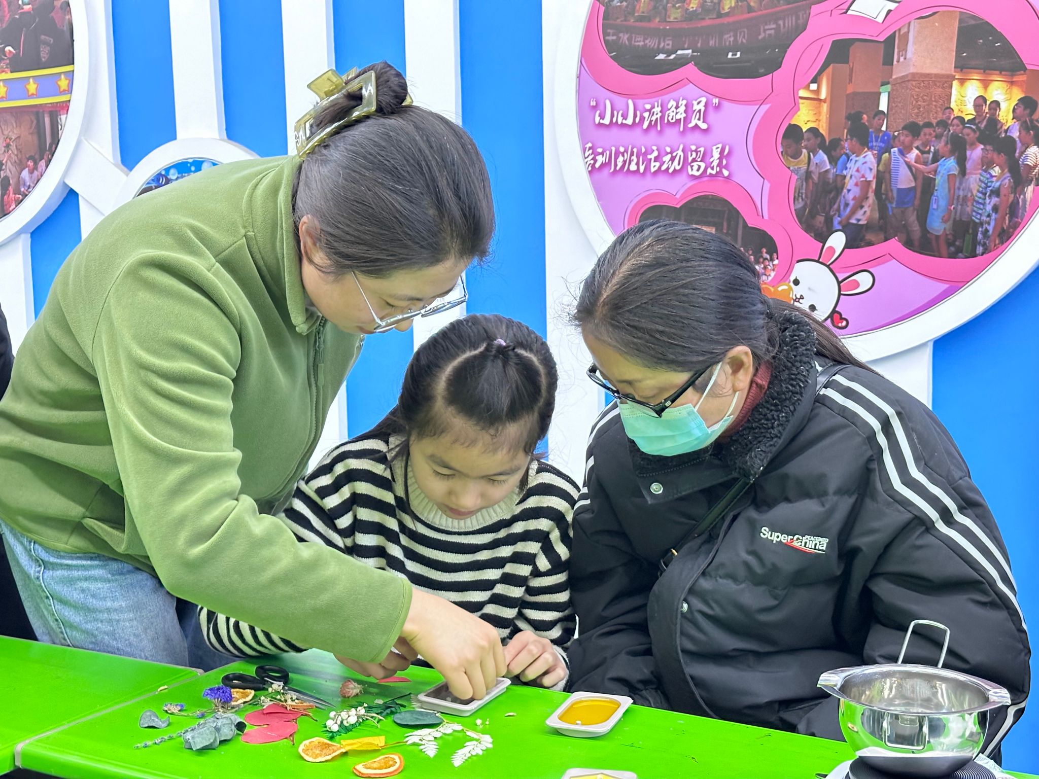 融铸一块精致的挂牌,包含各种谷物和干花,炼化一缕沁人的幽香。活动现场,宣教老师已经早早准备好了蜡油、香薰精油、谷物等制作材料。孩子们认真听取了老师讲解制作的步骤,便迫不及待地开始动手制作了。通过融蜡、倒蜡、调色等步骤,蜡牌的基本模样已经定型。随后大家发挥“头脑风暴”,用五谷与干花装饰,制作出一个个别具匠心的香薰挂牌,大家畅享在手工带来的乐趣,欢声笑语此起彼伏。