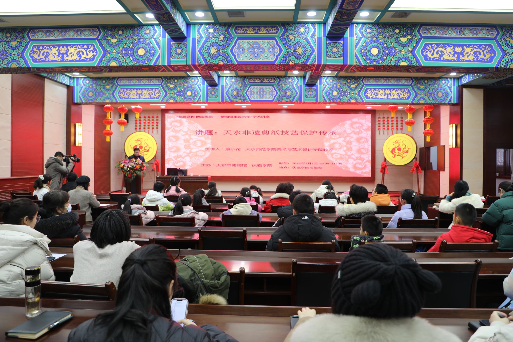 为深入学习贯彻习近平文化思想,进一步贯彻落实习近平总书记关于文物工作的重要论述和指示批示精神,按照国家文物局《关于组织开展2024年“博物馆里过大年”活动的通知》,结合省文旅厅“百日千场”文化活动、省文物局《全省博物馆文化传播服务优化提升工作方案》等,天水市博物馆立足博物馆馆藏资源,积极组织策划了“龙腾盛世 博动陇原——博物馆里过大年”系列社教活动。2月1日,天水市博物馆结合“巧手剪窗花 笑语迎新春”小年社教活动,特邀天水师范学院美术与艺术设计学院教授、硕士生导师康小花作了学术讲座,讲座由天水市博物馆副馆长崔文刚主持,天水市博物馆职工及参与社教活动的学生及家长80余人参加。