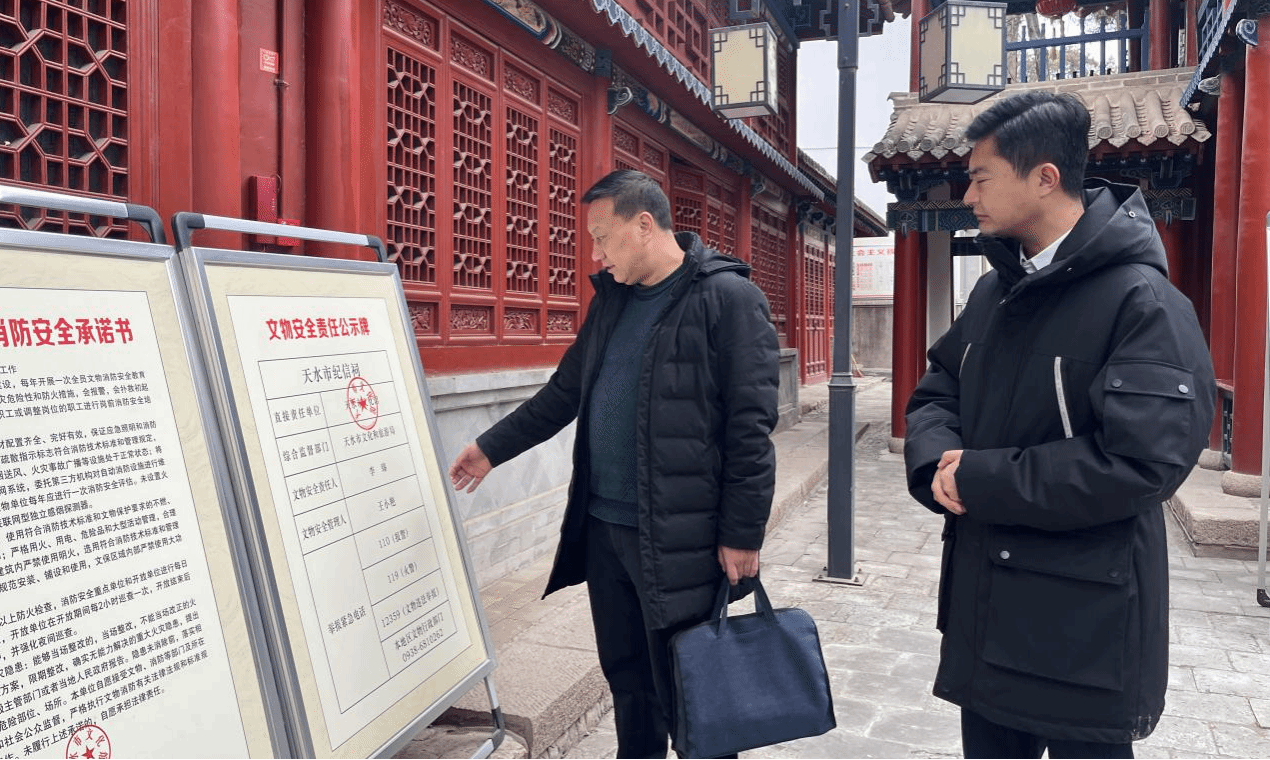 为全面压实文物安全责任,防范各类文物安全事故的发生。2月4日至6日,市文化和旅游局副局长、市文物局局长刘宗林带领局文物安全监管科工作人员对伏羲庙、纪信祠、天水美术馆、玉泉观、南郭寺、66号院和西关古城等文保单位进行春节前文物安全大检查。
