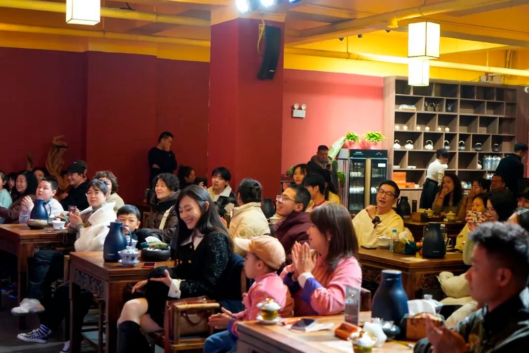 德艺坊相声社里,台上演员一捧一逗默契十足,花样展现“说学逗唱”四门功课,单口、对口、群口三种表演形式依次呈现,台下观众欢声不断笑语不停。