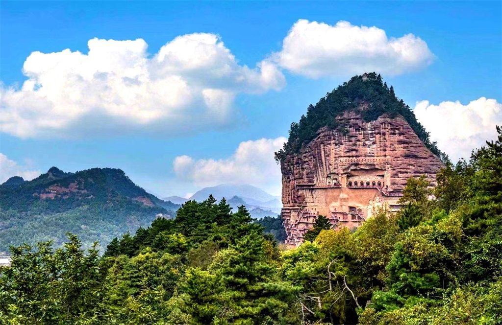 【麦积山石窟】麦积山又名麦积崖,孤峰崛起,犹如麦垛。山峰的西南面为悬崖峭壁,著名的麦积山石窟就开凿在这峭壁上。现保存窟龛221个,泥塑、石刻10632件,壁画1000余平方米。麦积山周围风景秀丽,山峦上密布着翠柏苍松、野花茂草,云雾阵阵,构成了 “麦积烟雨”。