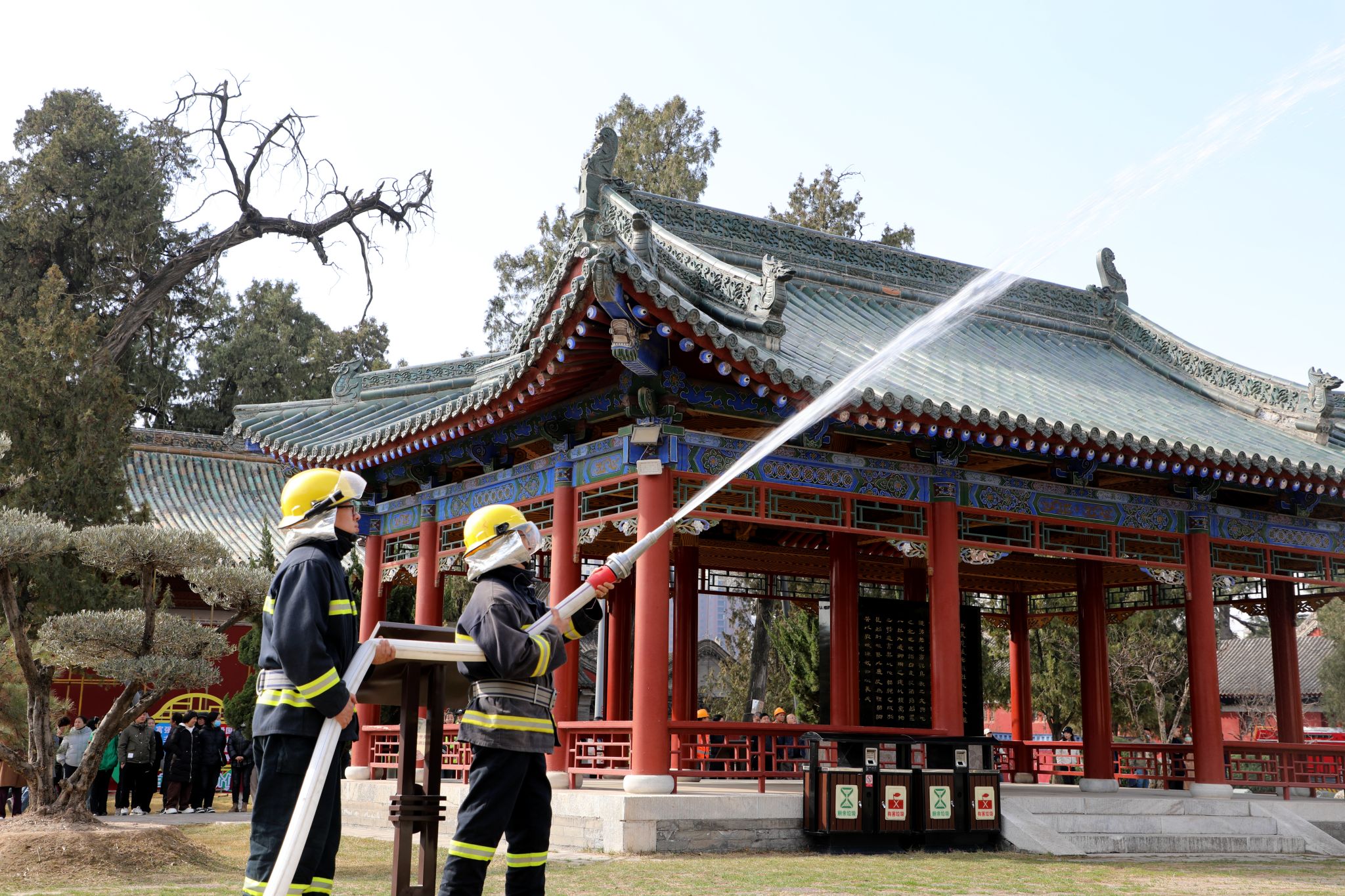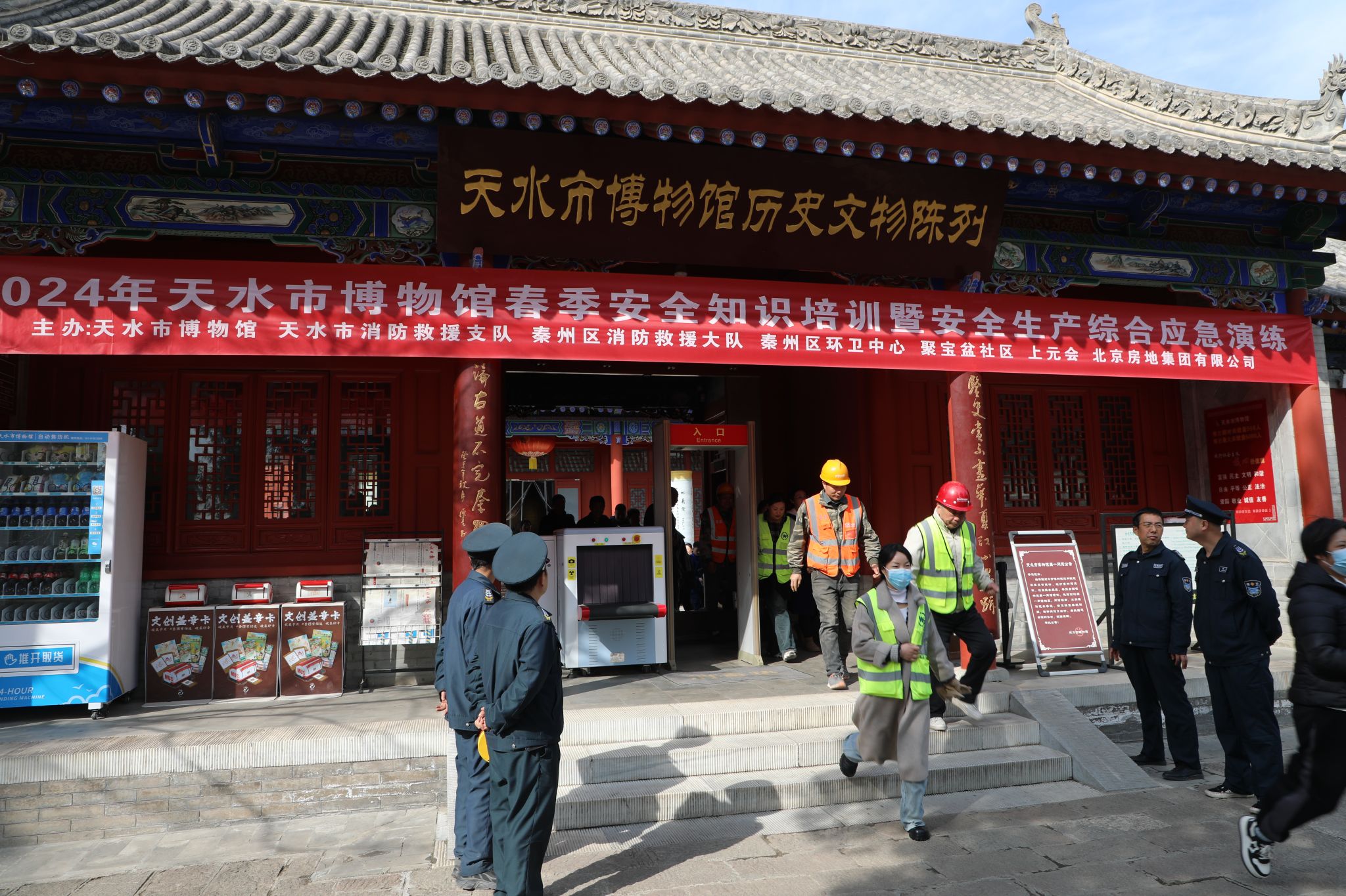 培训结束后,全体参训人员在天水市博物馆历史文物陈列馆、伏羲庙先天殿分别开展了火灾报警、应急疏散、应急救护、现场警戒等科目演练,在伏羲庙后花园见易亭开展了利用地下消火栓扑灭古建筑火灾演练。