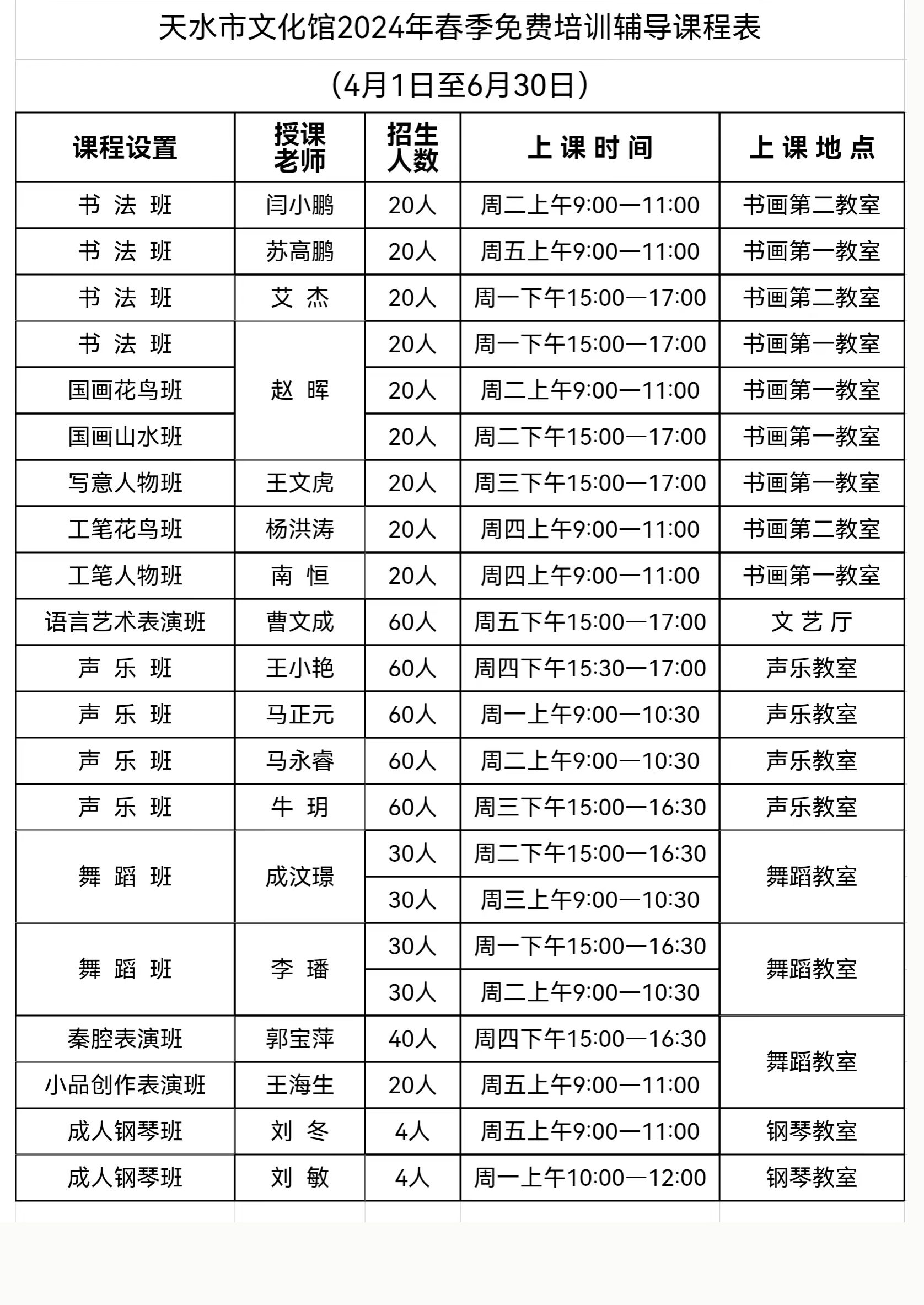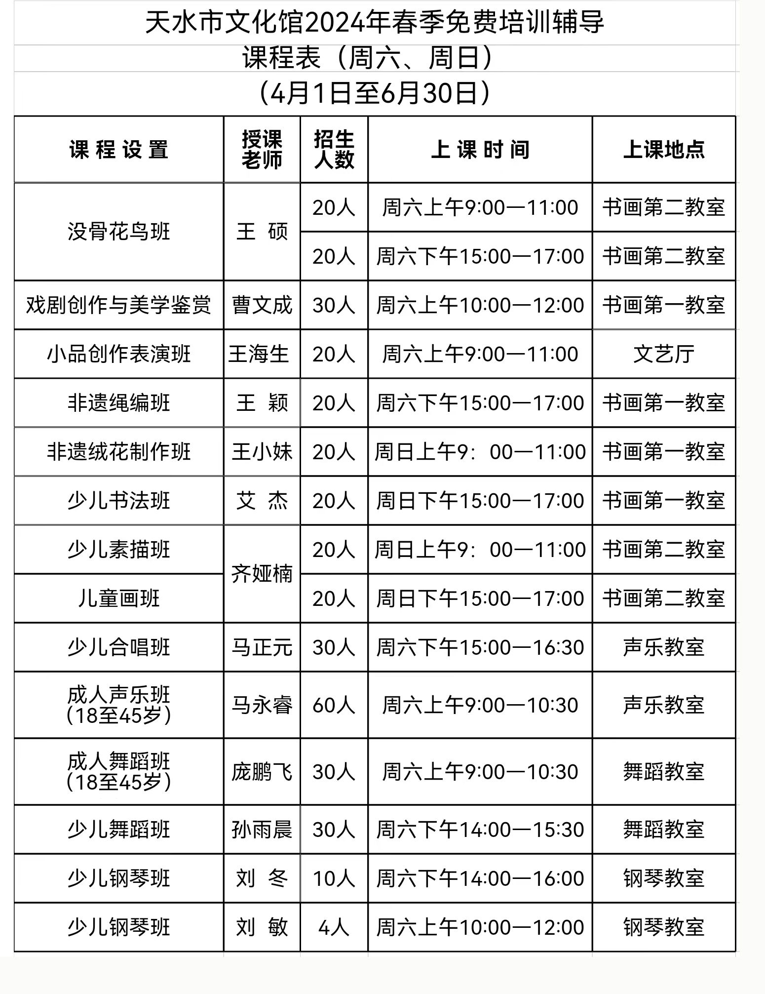 为了进一步履行文化馆公共文化服务职能,实现和保障人民群众基本文化权益,提高群众对文化生活的满意度和获得感,推进全民美育培训,提升群众审美素养、陶冶情操、温润心灵、激发创新创造力。天水市文化馆在延续以往培训辅导教学的基础上,新增设了非遗传承项目培训班、戏剧创作与美学鉴赏班、周末舞台表演门类青年班、少儿书法班、少儿素描班、儿童画班等六个科目,本期共开设二十二个艺术科目的免费培训班。相关招生情况如下: