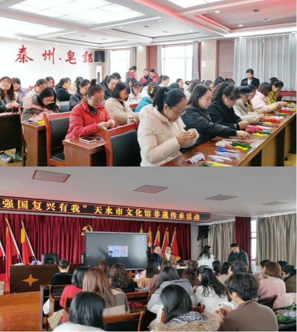 天水市文化馆组织非物质文化遗产代表性传承人、文化志愿者于3月5日、3月7日分别走进秦州区人力资源和社会保障局、秦州区皂郊镇社区开展“强国复兴有我”天水市文化馆非遗传承活动和庆祝“三八”妇女节非遗展示活动。活动现场,甘肃染尽三千文化产业发展有限公司非遗传承人为社区的妇女讲解了绒线手工编织传统工艺制作过程、色彩搭配、造型设计等细节。手把手教现场参与人员编制出了造型独特、色彩浓艳、纹样精美的各式手工艺品。手工编织技艺是勤劳的人民在劳动中创造出来的一种艺术表达形式,题材多样,色彩丰富,造型独特,这些艺术品除具有实用性和美观性外,还体现了普通劳动人民的智慧、深厚的文化底蕴和对美好生活的向往。