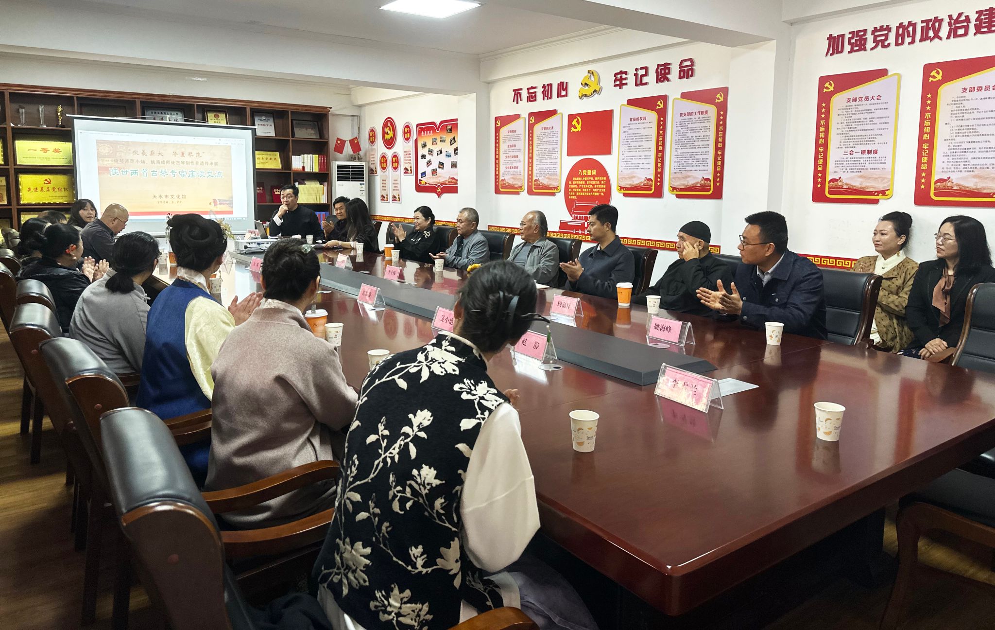 开幕式后,陕甘两省古琴名家在市文化馆举办了座谈会,一致认为此次古琴展是两地古琴制作和表演传承人互相学习互相促进秦文化的一场成功范例,将进一步推动古琴制作技艺的传承发展,并表示将加强交流合作,携手并肩,为弘扬古琴文化做出积极努力。