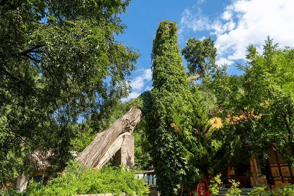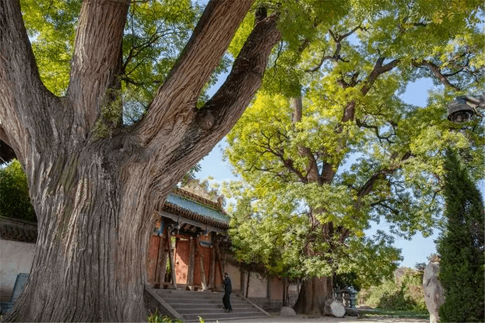 “唐槐”即国槐。由于这两棵槐树对称地生长在山门两侧,个头相当,树形相似,并且都长得枝繁叶茂,浓密如盖,就像两位守门将军,给山寺增添了几分庄重和肃穆,于是人们又叫它为“将军槐”。