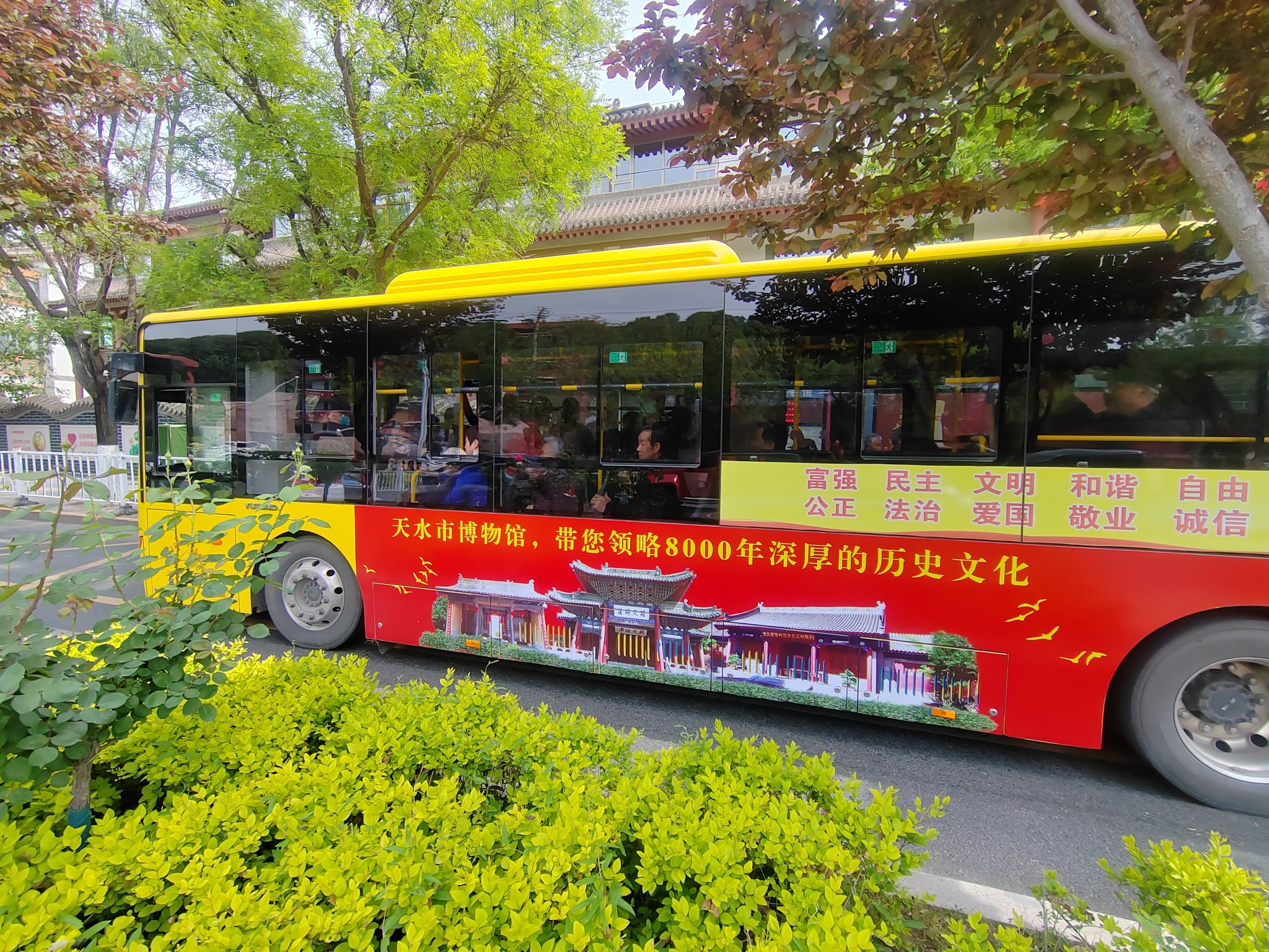 本次亮相公交车及车站站台灯箱植入的文物元素,主要以馆藏精品文物资源、伏羲文化、大地湾文化、工业文化、农耕文化等元素为宣传主题,选定线路为6路、21路和24路公交专线。并在伏羲庙、兰天广场、万达广场、百货大楼等车站灯箱植入文物宣传元素,便于广大公众和游客感受全新文化气息,穿越历史隧道,领略中华民族精神根脉,了解美丽打卡城市天水厚重的历史文化瑰宝。