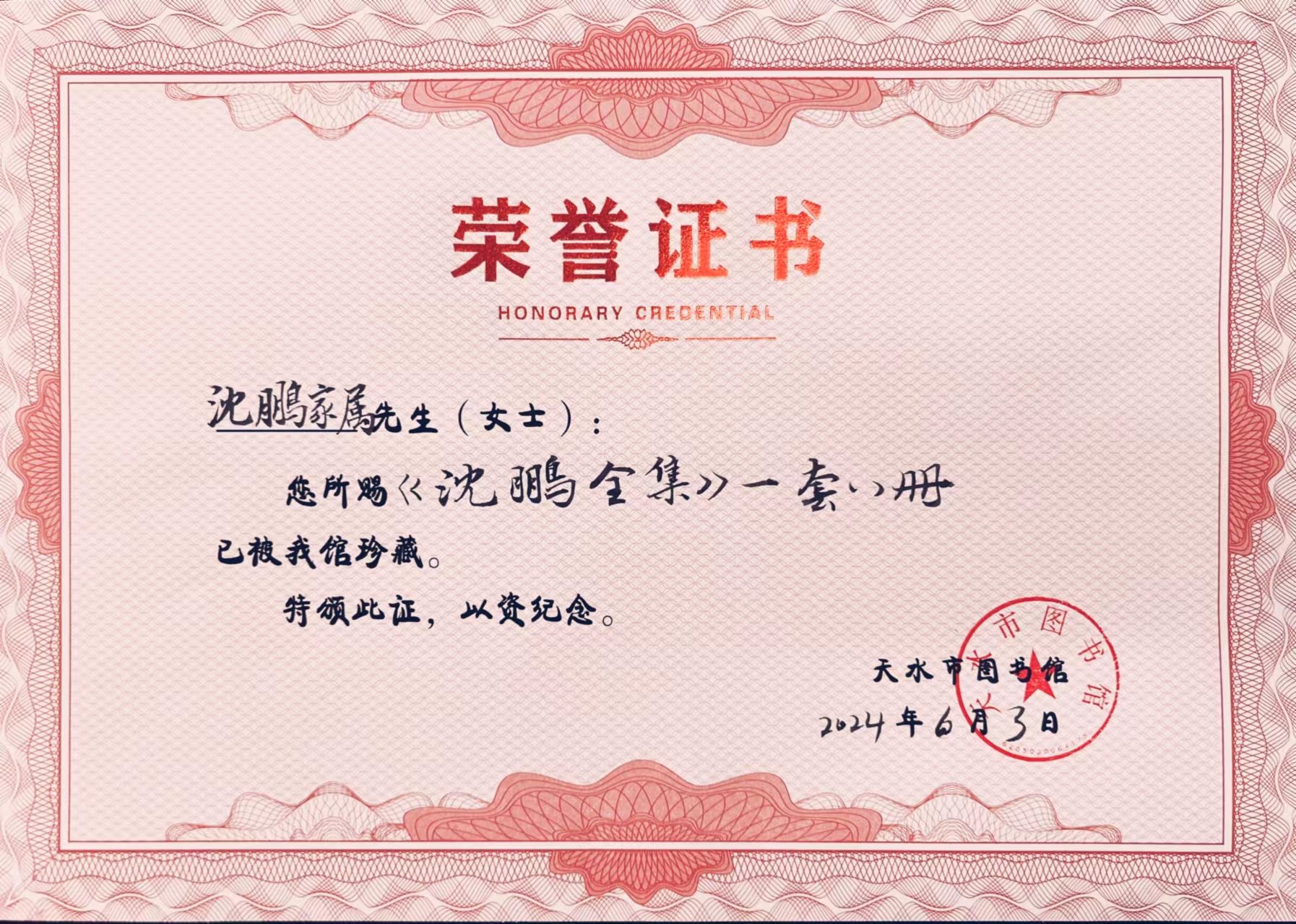 日前,已故第八届全国政协委员,原中国书法家协会常务理事、主席,著名书法家、美术评论家、诗人沈鹏先生家属通过邮寄向天水市图书馆赠送了由书法出版社出版的学术研究以及书法创作轨迹和成果的《沈鹏全集》一套。