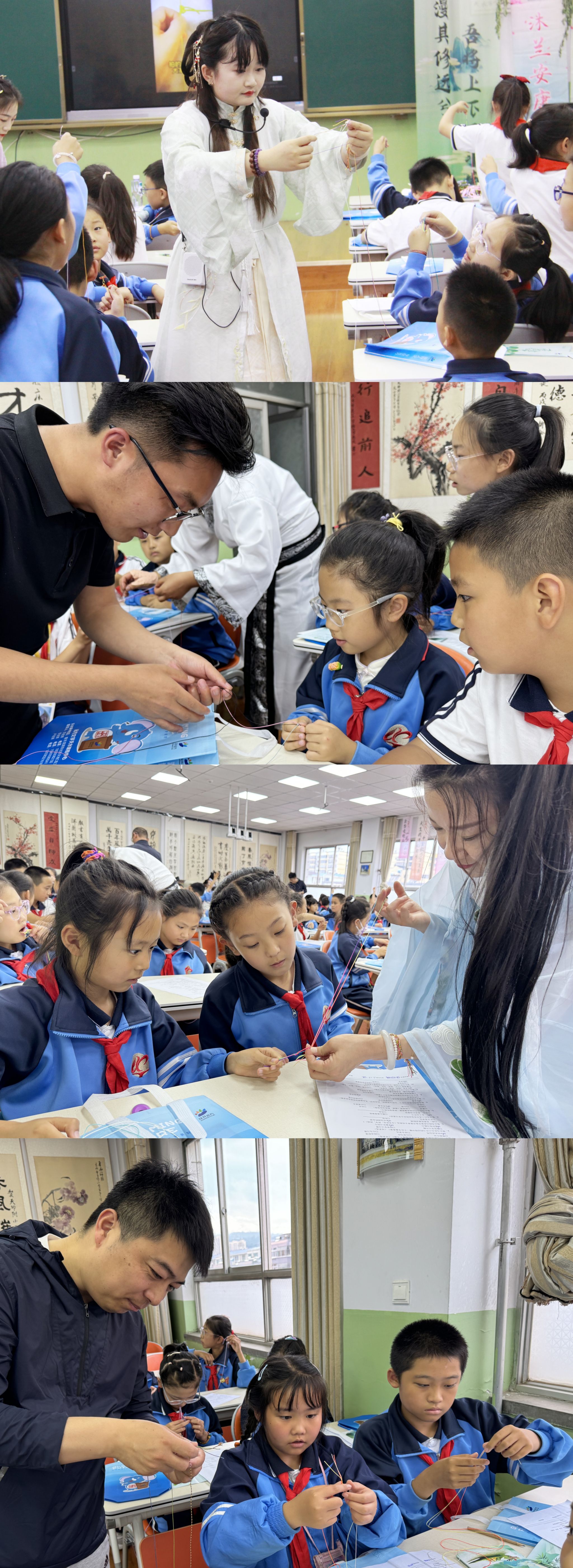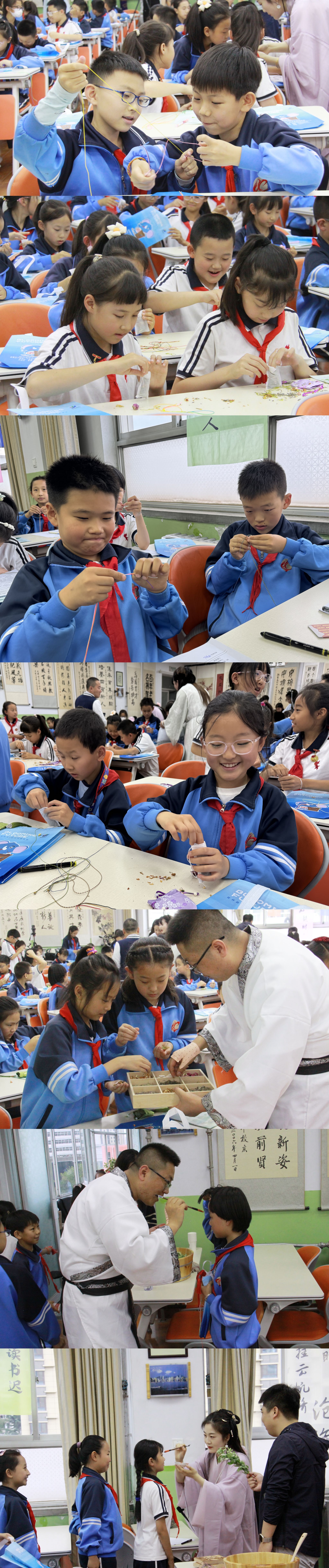 同学们在老师指导下现场沐兰汤、制作五彩绳、制作香包、拓印,沉浸式感受端午文化,体会端午精神。