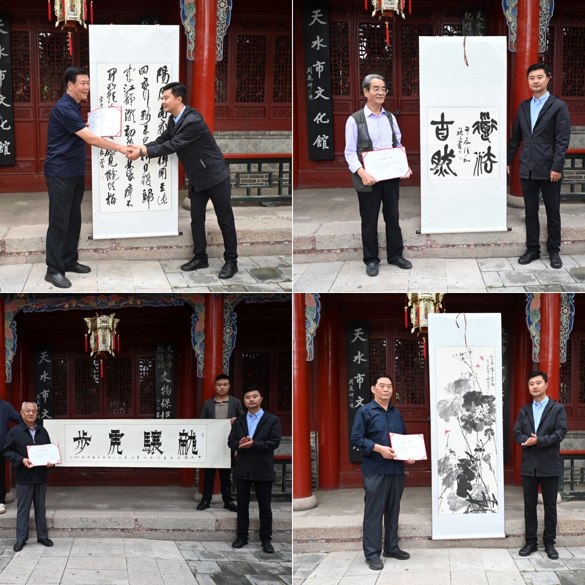 本次活动省老年基金会书画家向天水市文化馆捐赠书画作品11幅,天水市文化馆主要负责人接受了各位书画艺术家的捐赠,并向省老年基金会表示了感谢。