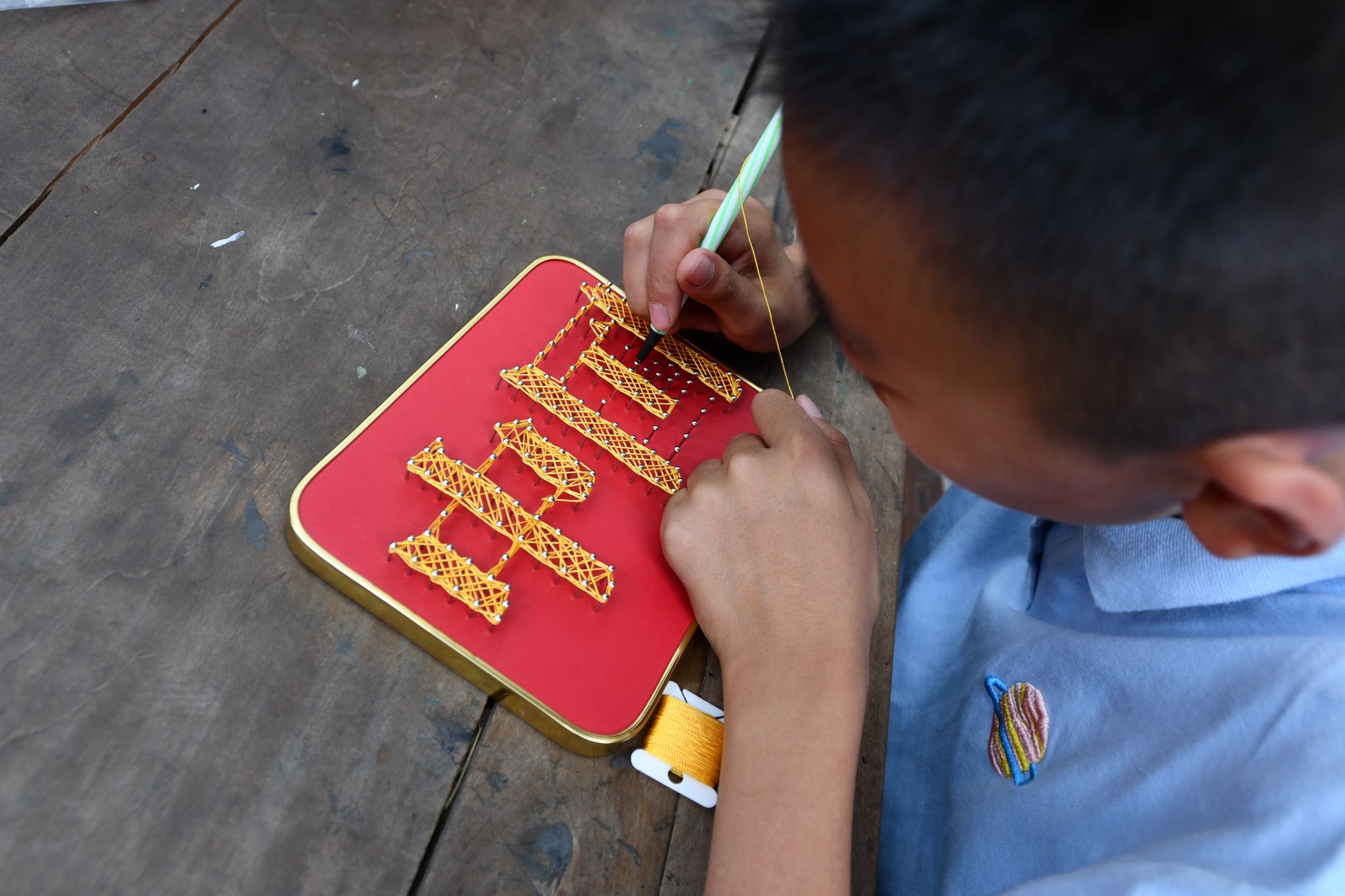 活动当天,社教专员先向孩子们介绍了建党节的由来,以及党旗、党徽的含义,着重讲述了钉子绕线画的制作原理和注意事项。随后同学们开始了自己的手工制作。别小看钉钉子,这不仅是个体力活,更是个技术活,既要钉得稳,又要注意钉子之间的间距要均匀,更要保持钉子在同一水平高度。小锤子敲敲打打,此起彼伏的敲击声响成一片。进入绕线环节,孩子们发挥自己的想象力,聚精会神投入其中。通过不断的摸索和实践,找到了制作规律,由生疏变得得心应手。看着完成的一件件作品,同学们也获得了满满的自豪感。