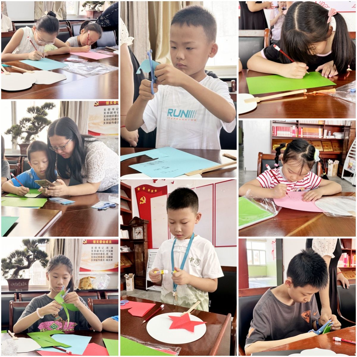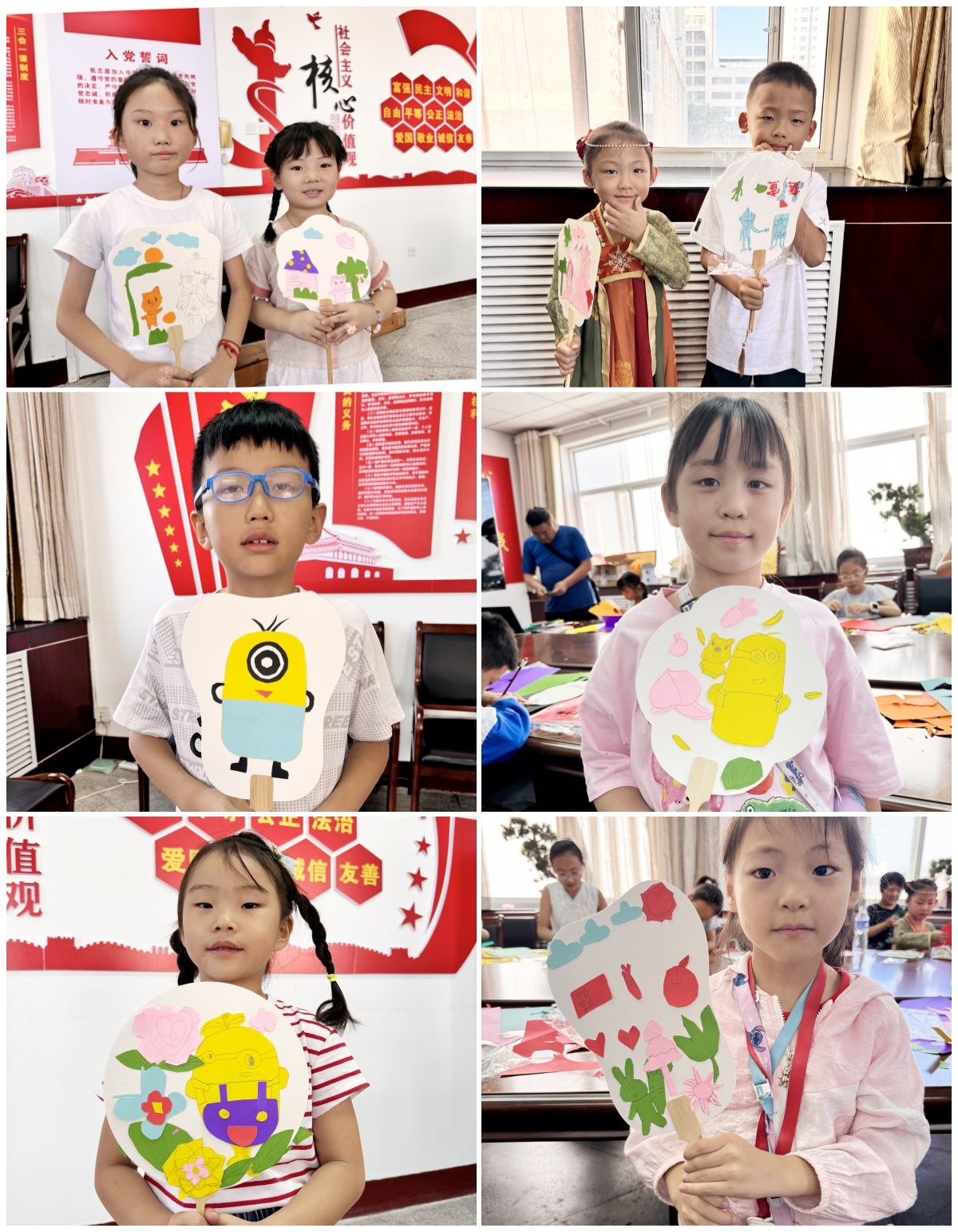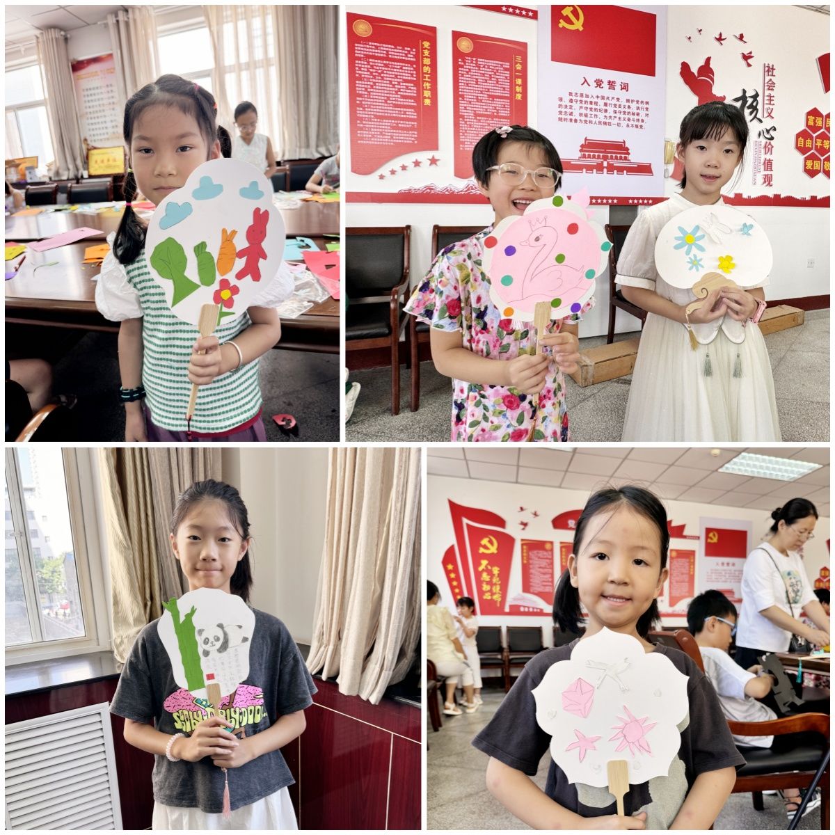 团扇作为中国传统工艺品,承载着丰富的文化内涵和艺术价值。在活动中,志愿者老师首先为大家介绍了团扇的基本知识。接下来,小朋友们开始亲手制作团扇,从选择合适的扇面、设计图案,到粘贴装饰,每一步都充满了乐趣和挑战。活动现场,小朋友们或围坐一起,或亲子合作,共同完成作品,享受着制作过程中的欢声笑语。