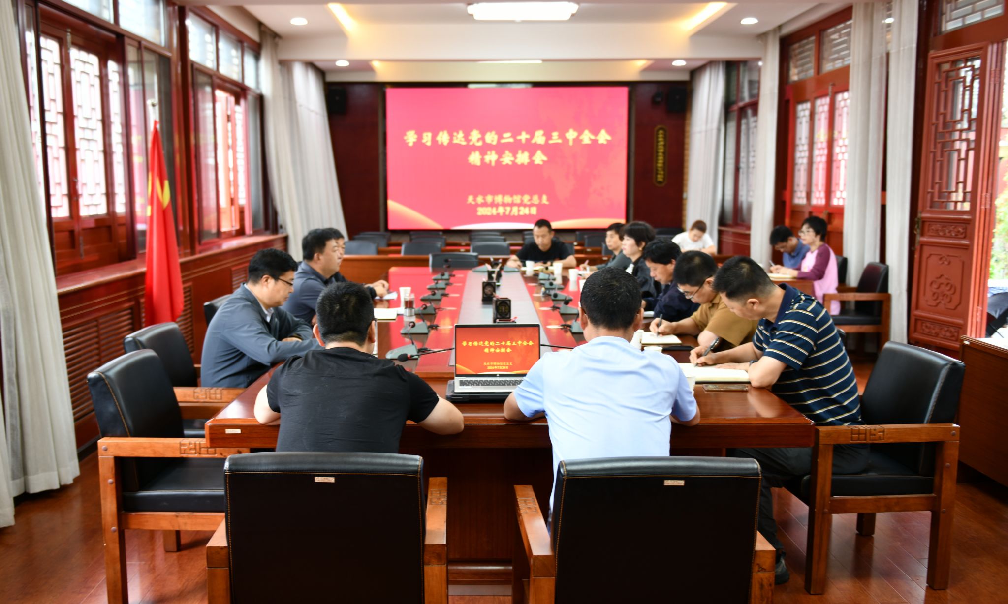 7月24日上午,天水市博物馆召开学习党的二十届三中全会精神专题会议,党总支书记、馆长刘玉璞主持会议,馆领导班子成员、各部室负责人参加会议。