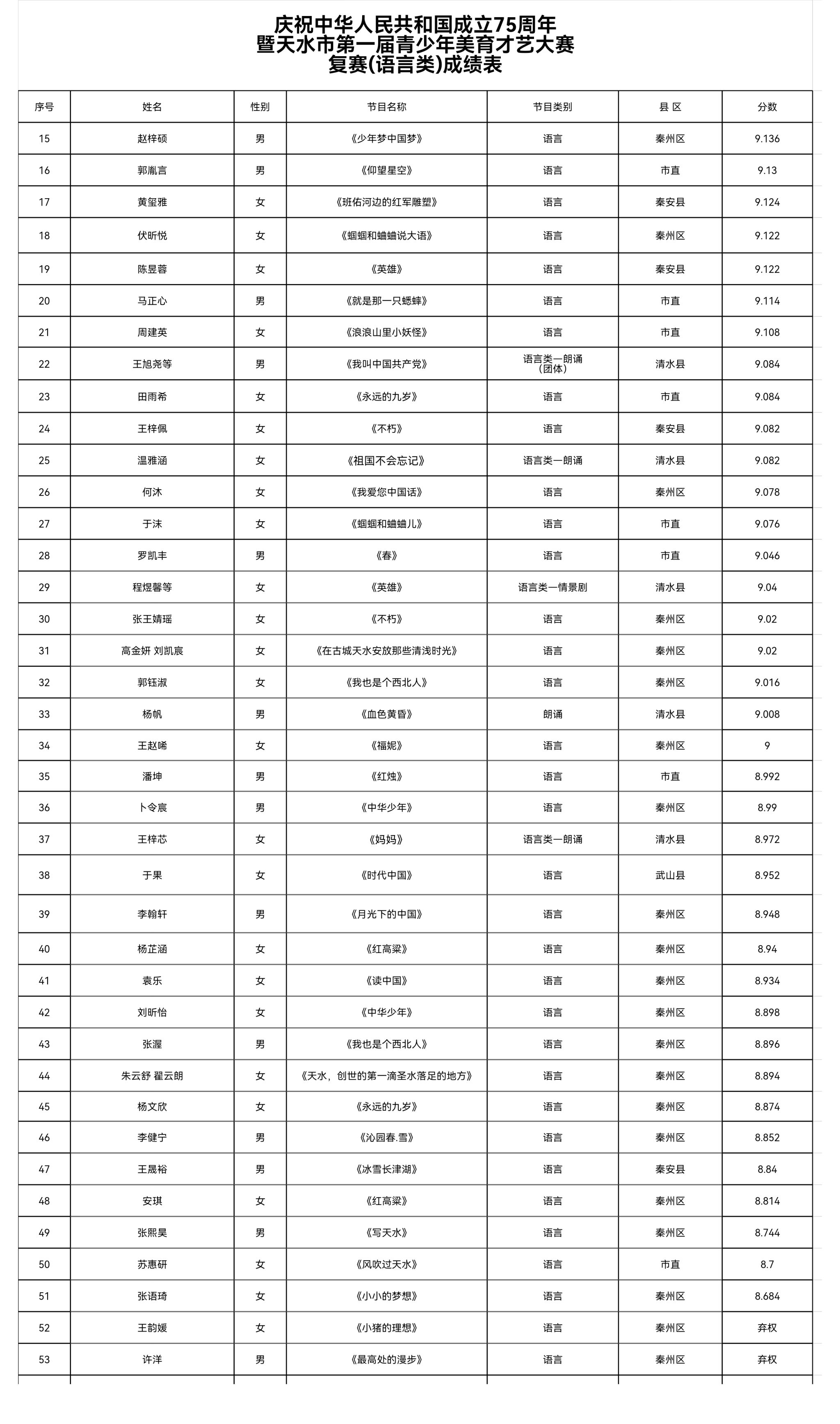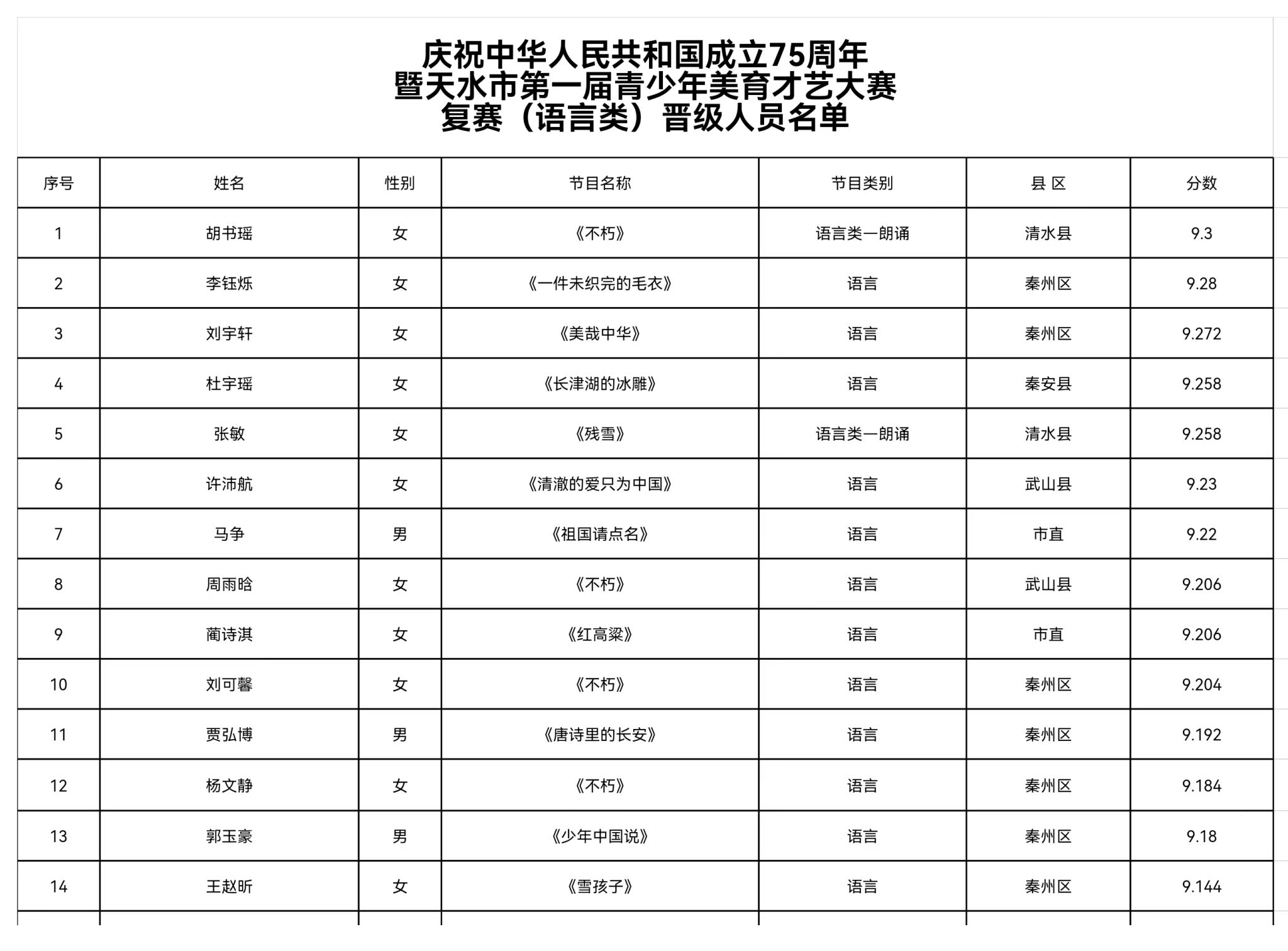 8月5日,由中共天水市委宣传部、天水市文化和旅游局、中国共产主义青年团天水市委员会主办,天水市文化馆、各县区文旅局承办,各县区文化馆协办的庆祝新中国成立75周年暨天水市第一届青少年美育才艺大赛复赛第四场(语言类)在市文化馆成功举办。