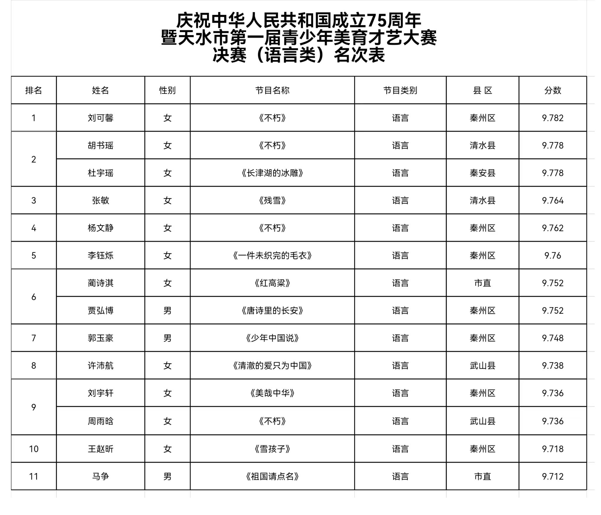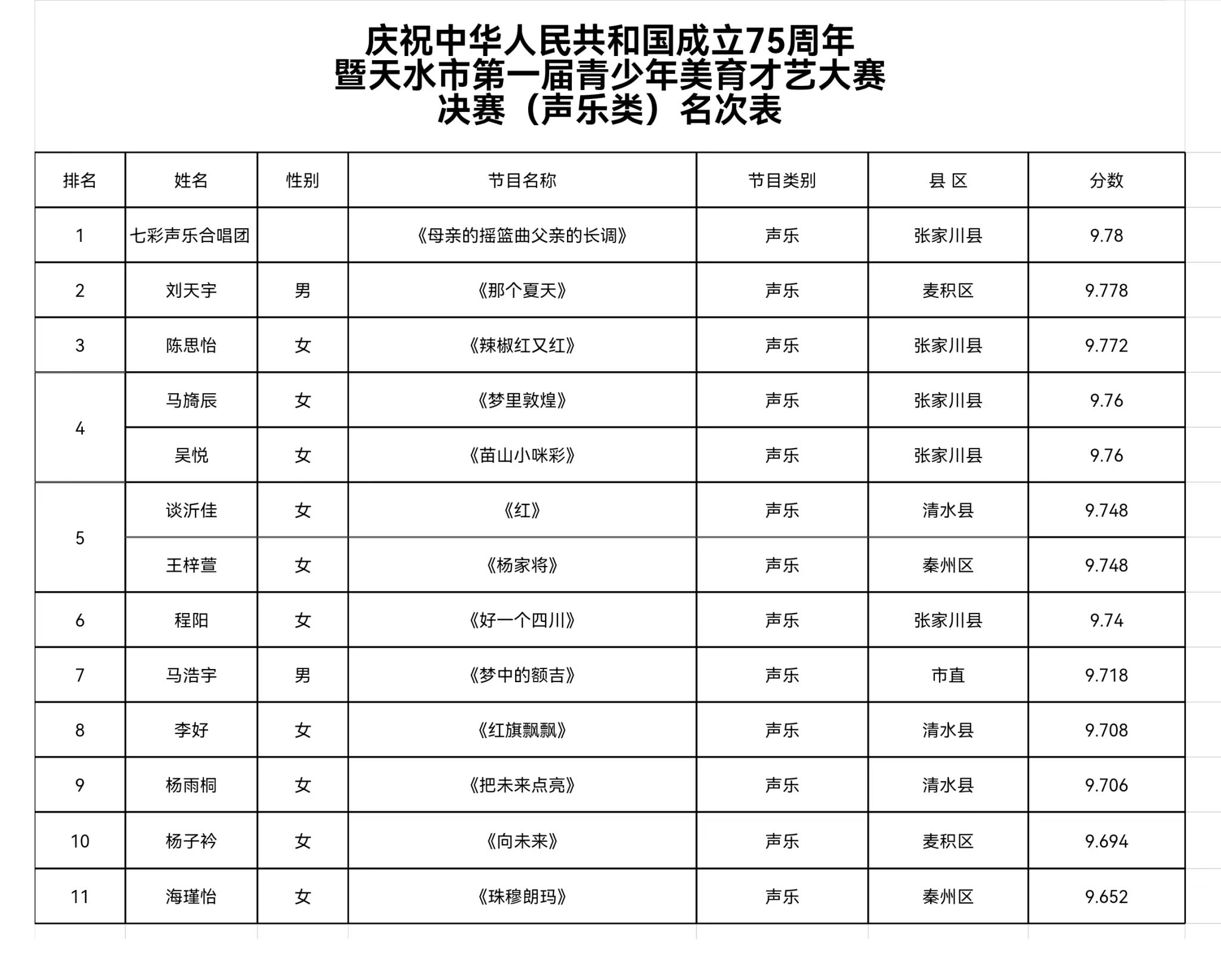 8月6日,为庆祝中华人民共和国成立75周年,充分发挥文化馆赓续中华传统文化、弘扬美育精神、践行全民艺术普及的重要使命,进一步加强未成年人美育教育,由中共天水市委宣传部、天水市文化和旅游局、中国共产主义青年团天水市委员会主办,天水市文化馆、各县区文旅局承办,各县区文化馆协办的庆祝中华人民共和国成立75周年暨天水市第一届青少年美育才艺大赛决赛圆满结束。