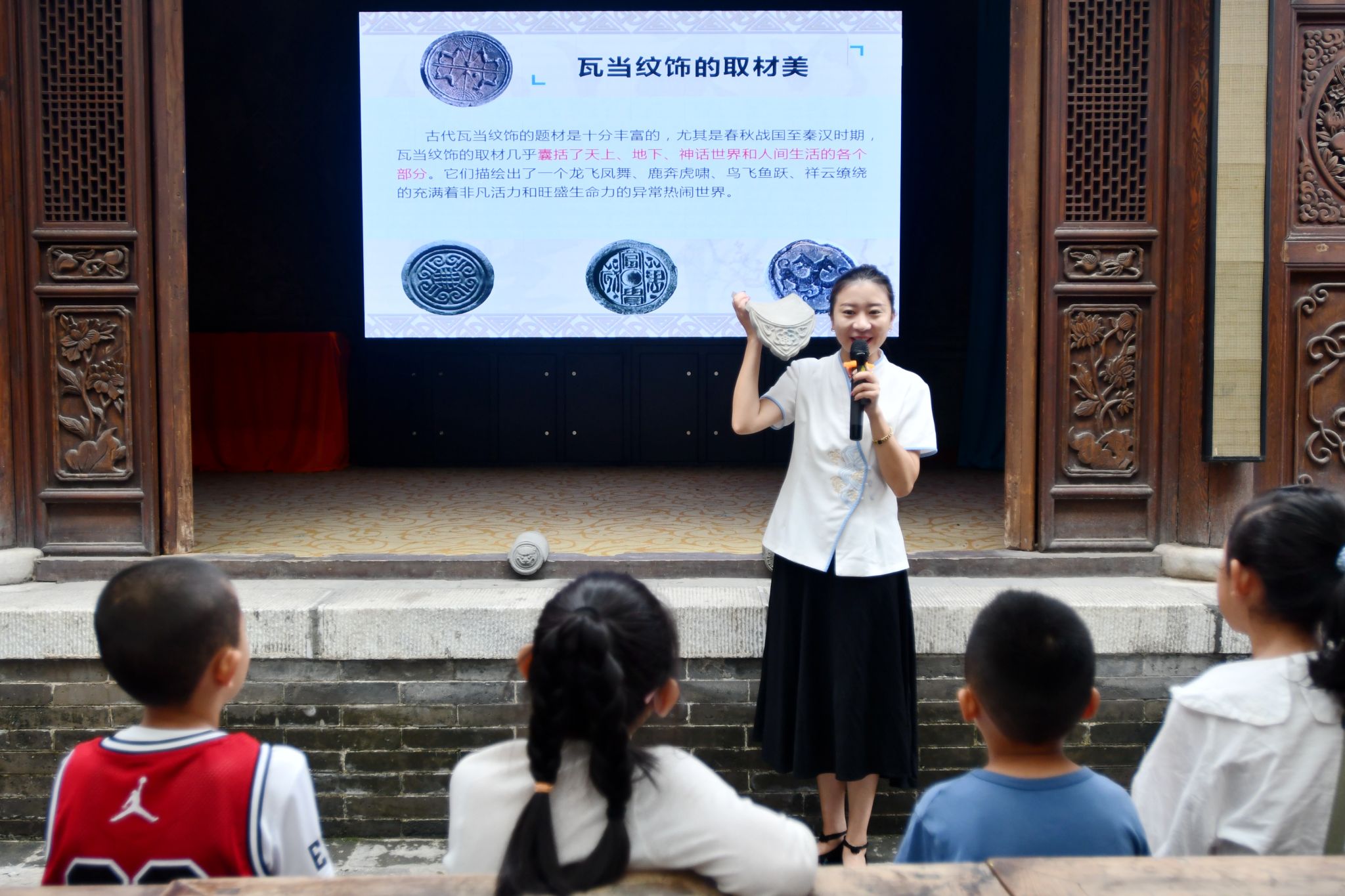 本次活动主要分三个环节。首先,同学们在讲解员的带领下参观了胡氏古民居建筑群。参观过程中,讲解员对胡氏古民居的建筑风格和各类瓦当构件做了专题讲解。通过参观学习,同学们对古建筑有了全新的认识。随后,社教专员通过PPT向大家介绍了瓦当的由来、作用以及发展历史,从纹饰和制式的角度让大家了解瓦当文化,加深大家对古建筑历史的感悟。最后进入互动体验环节,社教专员分别将滴水、猫头、筒瓦、鱼鳞瓦等瓦当部件模拟摆放在模型房顶架上,让孩子们通过拆卸和重新组合认知各类瓦件的功能和用途。同时,社教专员展示了我馆设计制作的瓦当模具,演示了瓦当的制作流程和方法,随后由同学们依据示范程序自己动手操作,一件件充满泥塑艺术的瓦当就这样诞生了。