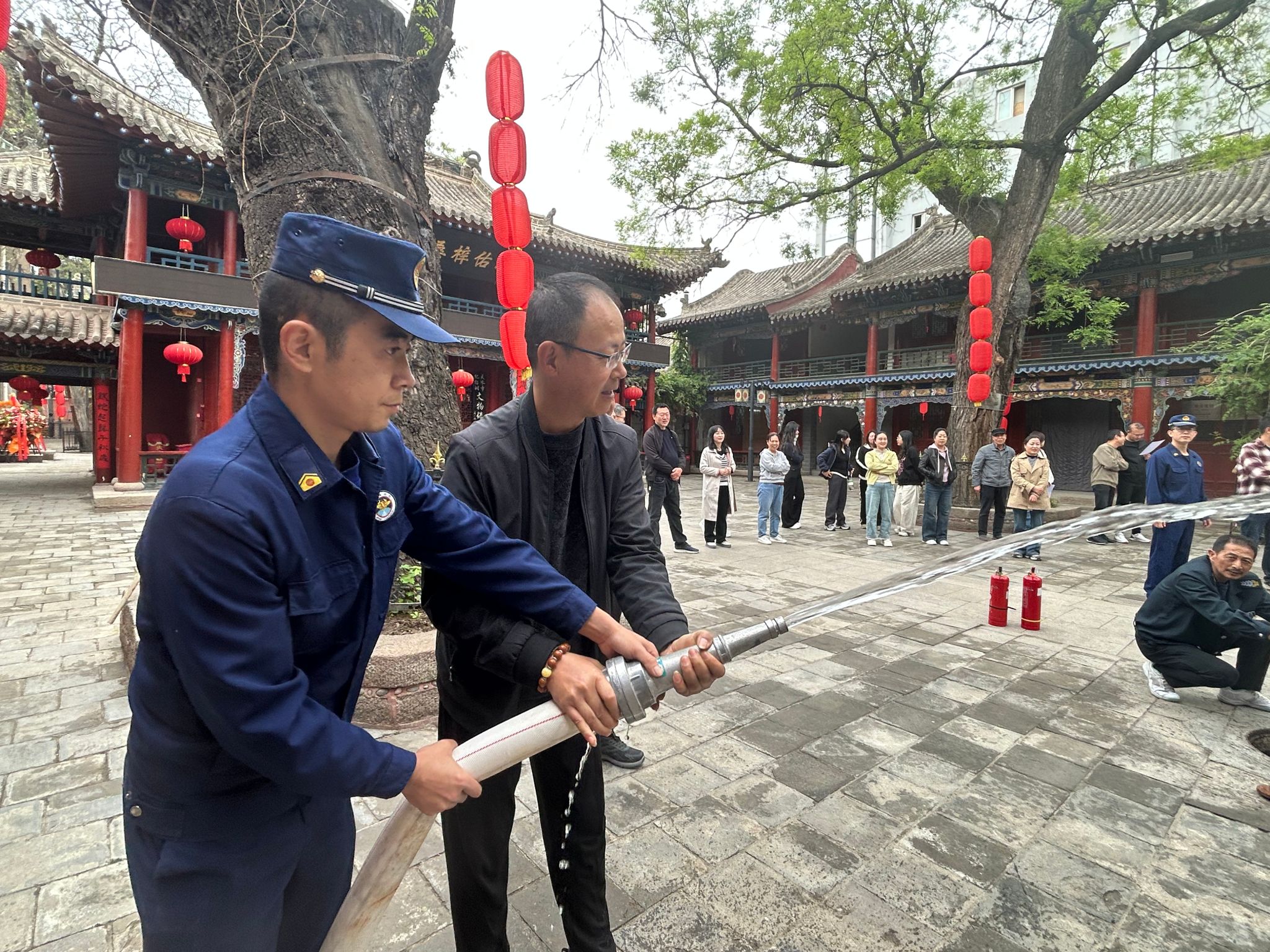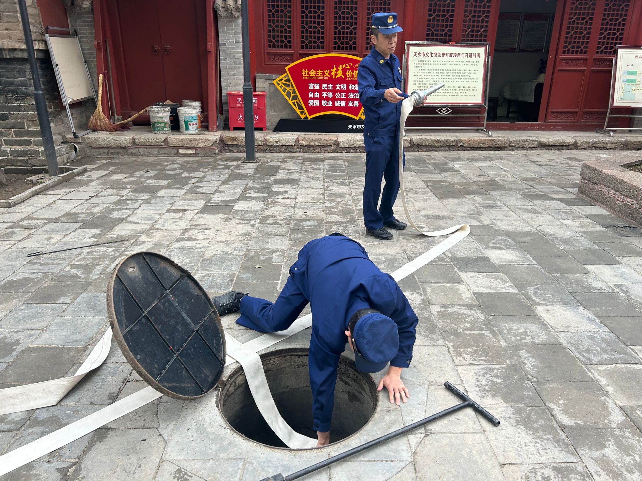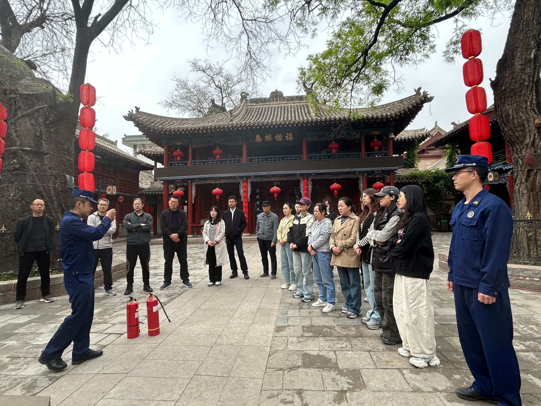 培训结束后,馆领导班子及各部室主任对场馆开展拉网式排查,对寝宫、大殿、展厅、办公区、消控室、消防通道等区域进行细致检查,测试消防设施运行状态。针对发现的问题,现场制定整改清单,针对“五一”期间人流量增加的情况,优化应急预案,加强值班值守,确保24小时专人值守。
