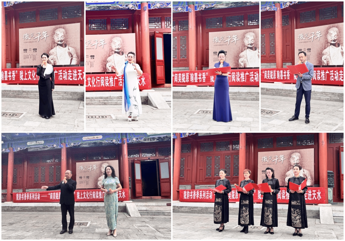 在诗词诵读互动区,天水老年大学和全民悦读天水校园阅读会成员现场进行诗词诵读,以诗会友。饱含深情的朗诵吸引游客们驻足聆听,诗韵流转间,古今名句碰撞,映照出千年文脉传承的动人景象。