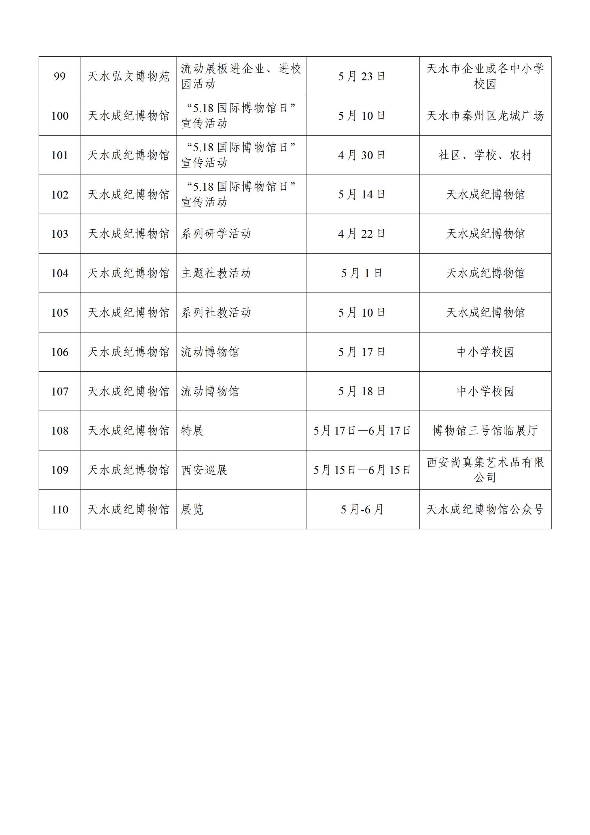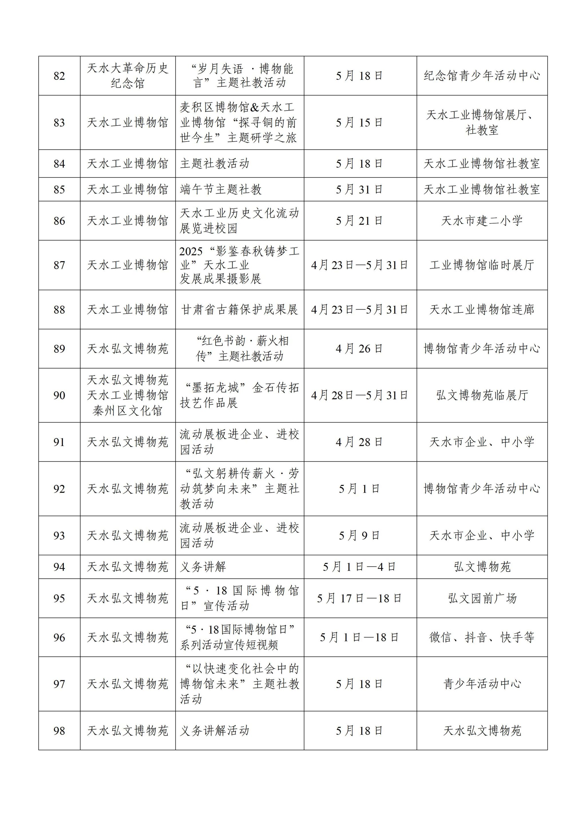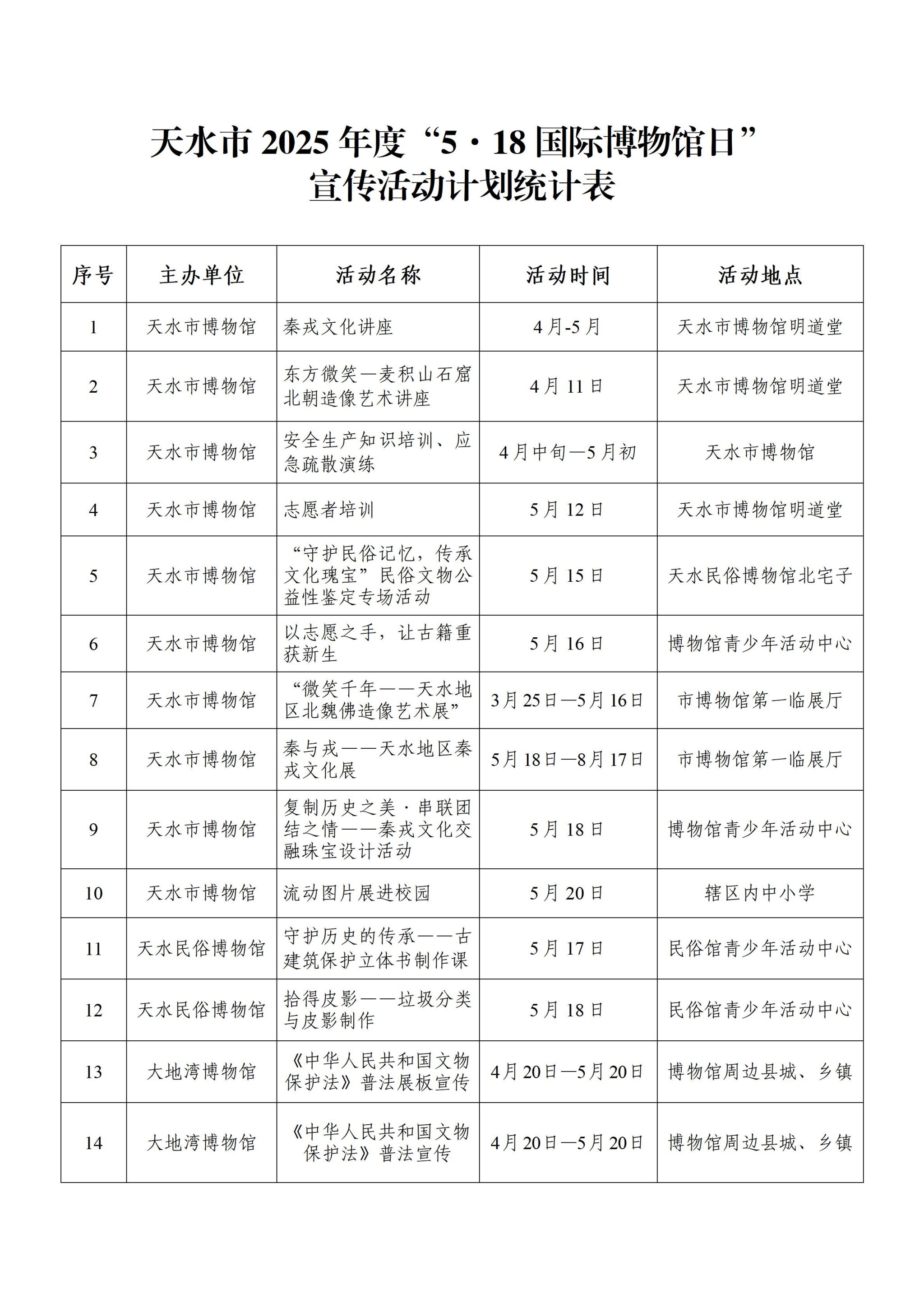 为迎接第49个国际博物馆日,天水市各级博物馆纪念馆精心策划推出110余项内容丰富、形式多样的“线上+线下”宣传活动,旨在通过临时展览、馆际合作、学术交流、社会教育、主题游径等形式,为观众搭建文化传承与科技创新的多元体验场景,增进公众对博物馆的认知与参与,特邀您一起走进博物馆,共赴一场文化之约!