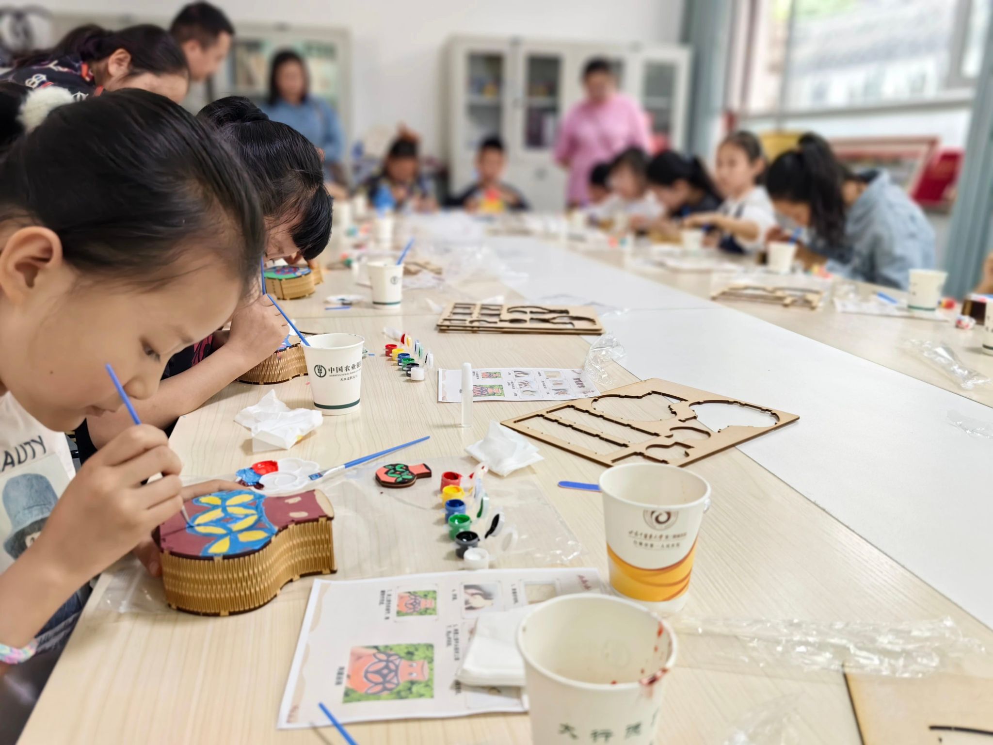最热闹的当属手工环节。孩子们化身"小木匠",对照图纸将木质构件拼成素胚陶罐。"这个凸起要卡进凹槽里!"8岁的王克中与妈妈通力合作,当榫卯严丝合缝咬合时,孩子兴奋地举起作品:"看!不用胶水也能这么牢固!"完成拼接后,素胚陶罐变身空白画布,孩子们用画笔在陶罐表面创作。有的以青花纹样致敬传统,有的用卡通图案演绎童趣,诞生出独一无二的“文创笔筒”。