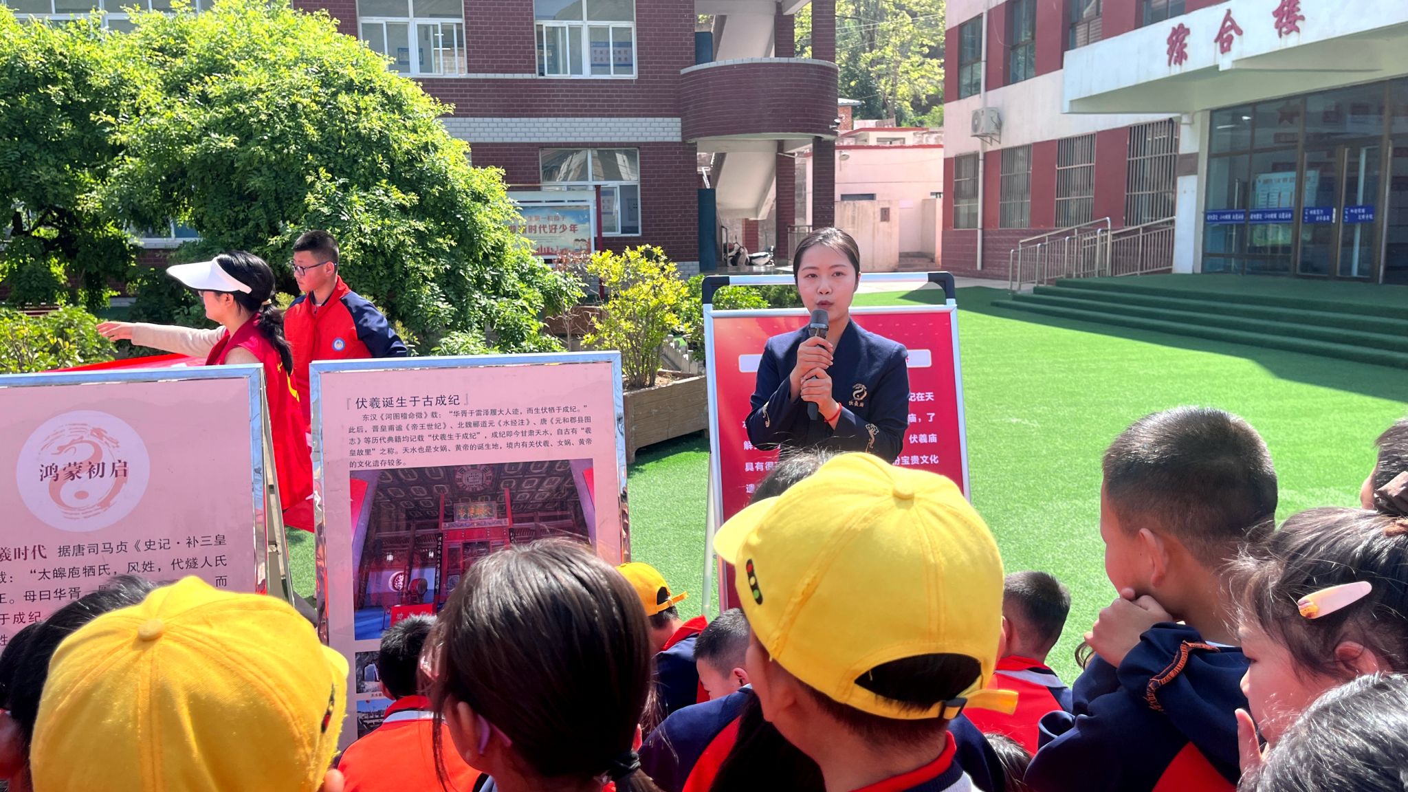 活动现场,讲解员依托常设流动展览《伏羲功绩展》 ,为全校师生介绍了伏羲文化以及伏羲氏作为中华人文始祖在中国历史上的重要地位。从伏羲“始作八卦,以通神明之德,以类万物之情”开启华夏民族智慧先河,到他“结网罟以教佃渔”推动生产方式进步;从“制嫁娶”奠定民族血脉根基,到创造琴瑟开启音乐文化篇章 ,讲解员用通俗易懂的语言讲解伏羲的伟大功绩,同学们听得津津有味。