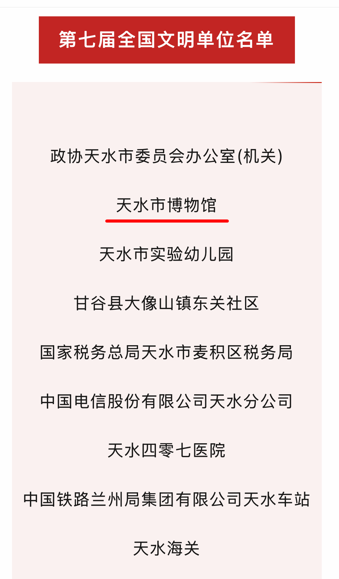 5月23日,全国精神文明建设表彰大会在京召开。中央宣传思想文化工作领导小组决定,授予4688个单位全国文明单位称号。其中,天水市博物馆荣获“全国文明单位”称号。