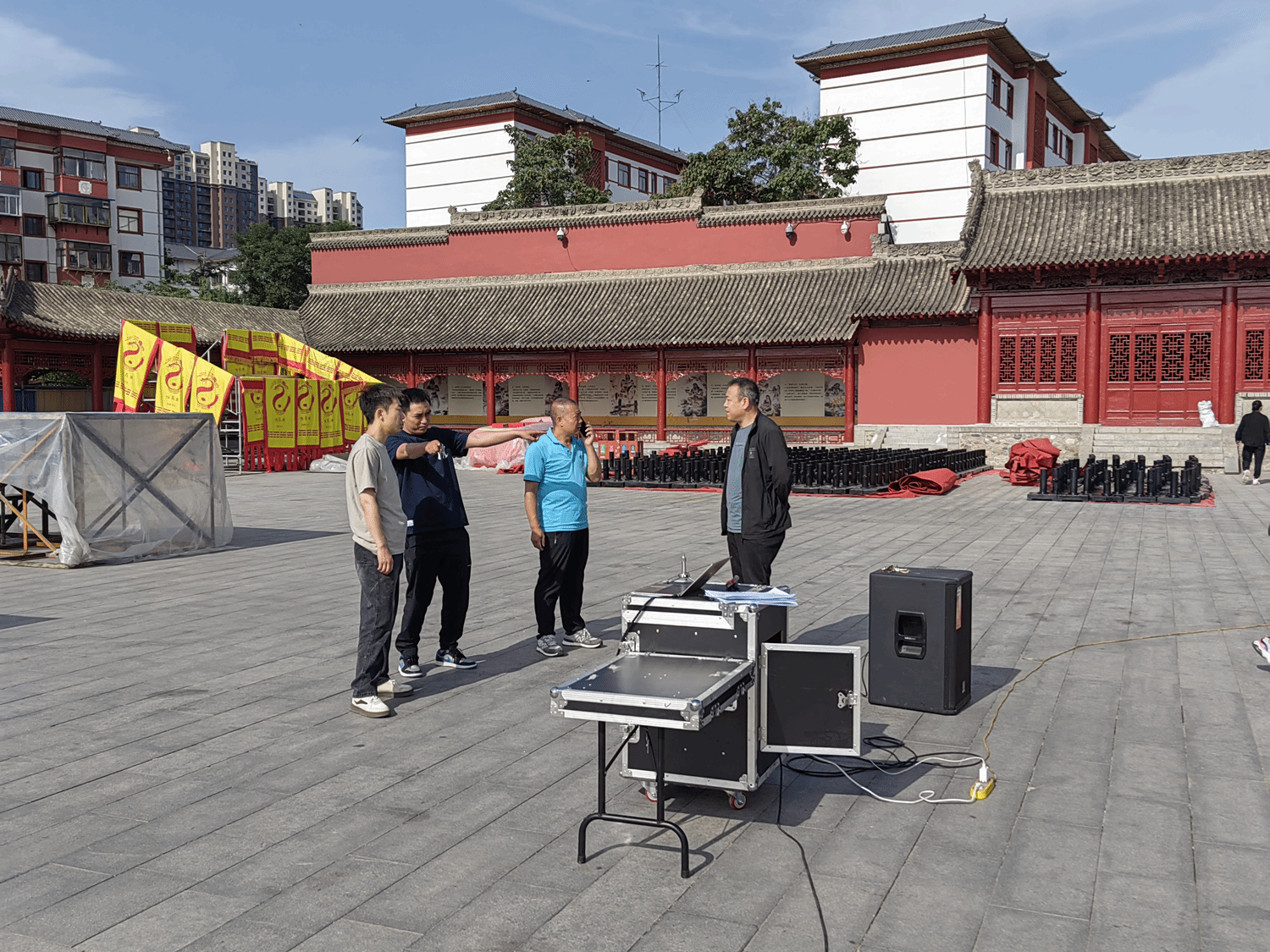 排练开始前,中心副主任乐舞告祭导演王时飞对全体演职人员就现场排练要求和安全注意事项进行了安排,要求所有演职人员能在这段时间里积极配合排练,不要迟到请假,高质量完成乐舞告祭的排练演出。因现场施工还未结束,要求大家注意安全,所有道具轻拿轻放、并严禁在现场吸烟。