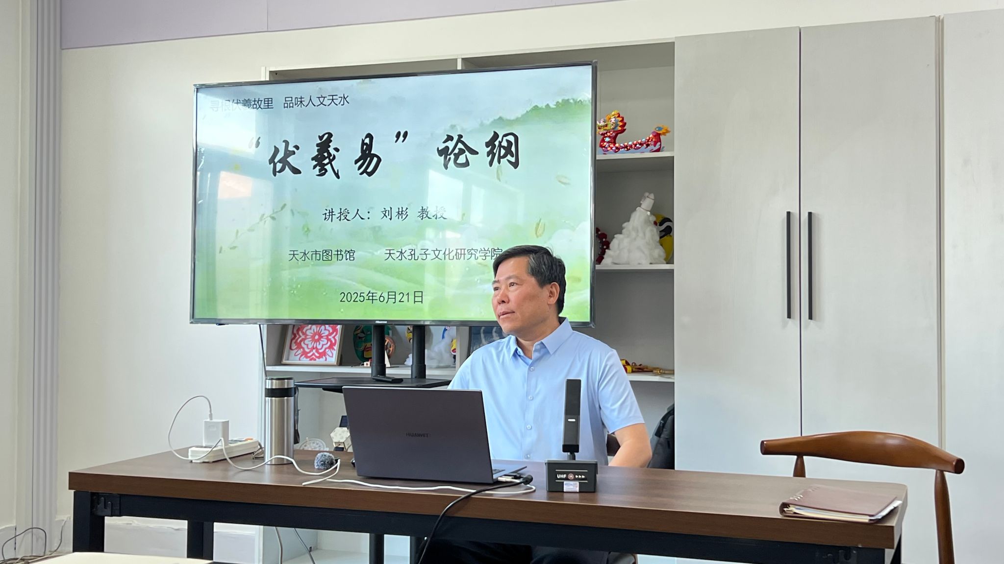 2025年6月21日下午,参加2025年公祭伏羲大典的嘉宾,山东曲阜师范大学二级教授、博士生导师、中国哲学方向带头人、东亚易学研究中心执行主任、孔子文化研究院副院长、中国周易学会常务理事、山东周易研究会副会长刘彬博士,应邀在天水市图书馆举办《“伏羲易”论纲》讲座。