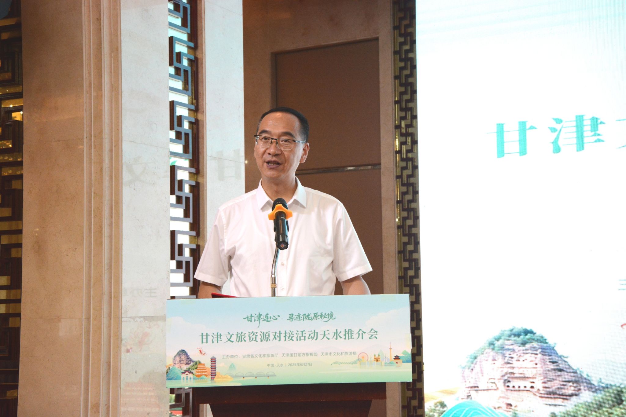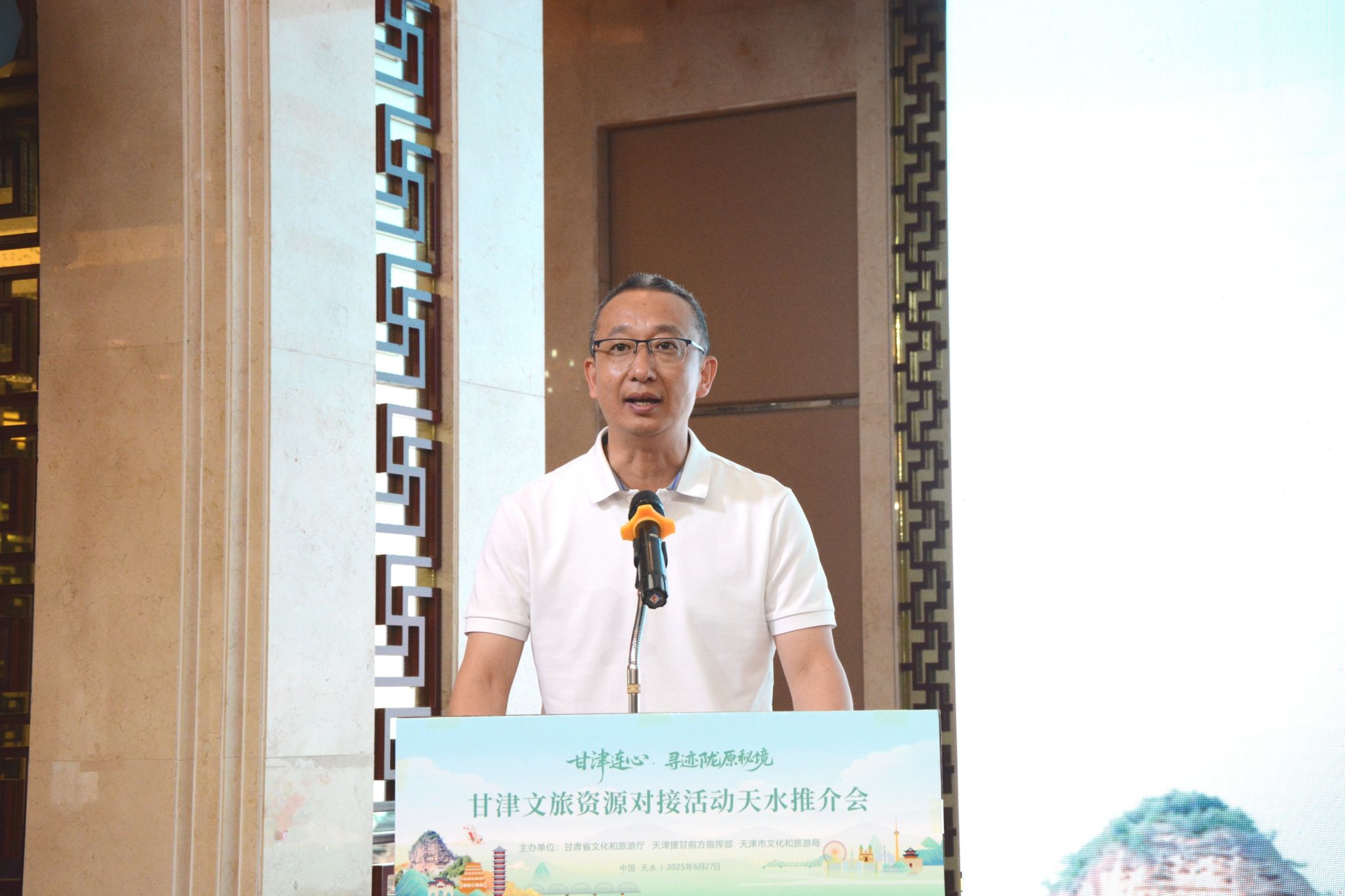 为深入贯彻习近平总书记关于深化东西部协作和定点帮扶工作的重要批示精神,持续加强甘肃与天津两地文旅交流合作,6月27日,“甘津连心·寻迹陇原文旅秘境”2025年甘津文旅资源对接活动在天水举行。甘肃省农业农村厅二级巡视员张有祖出席活动,天水市人民政府副市长董小平出席活动并致辞,甘肃省文旅厅节会与宣传推广处处长孙森,天津市和平区金街管委会主任、金街景区负责人龚泓如,天水市文旅局副局长李星杰出席活动。活动由天水市文旅局局长牛新虎主持。天津市重点旅行商及文旅投资企业代表,甘肃省重点文旅企业代表,甘津两地媒体及网络达人,天水文旅企业代表、媒体记者等140余人参加了此次活动。