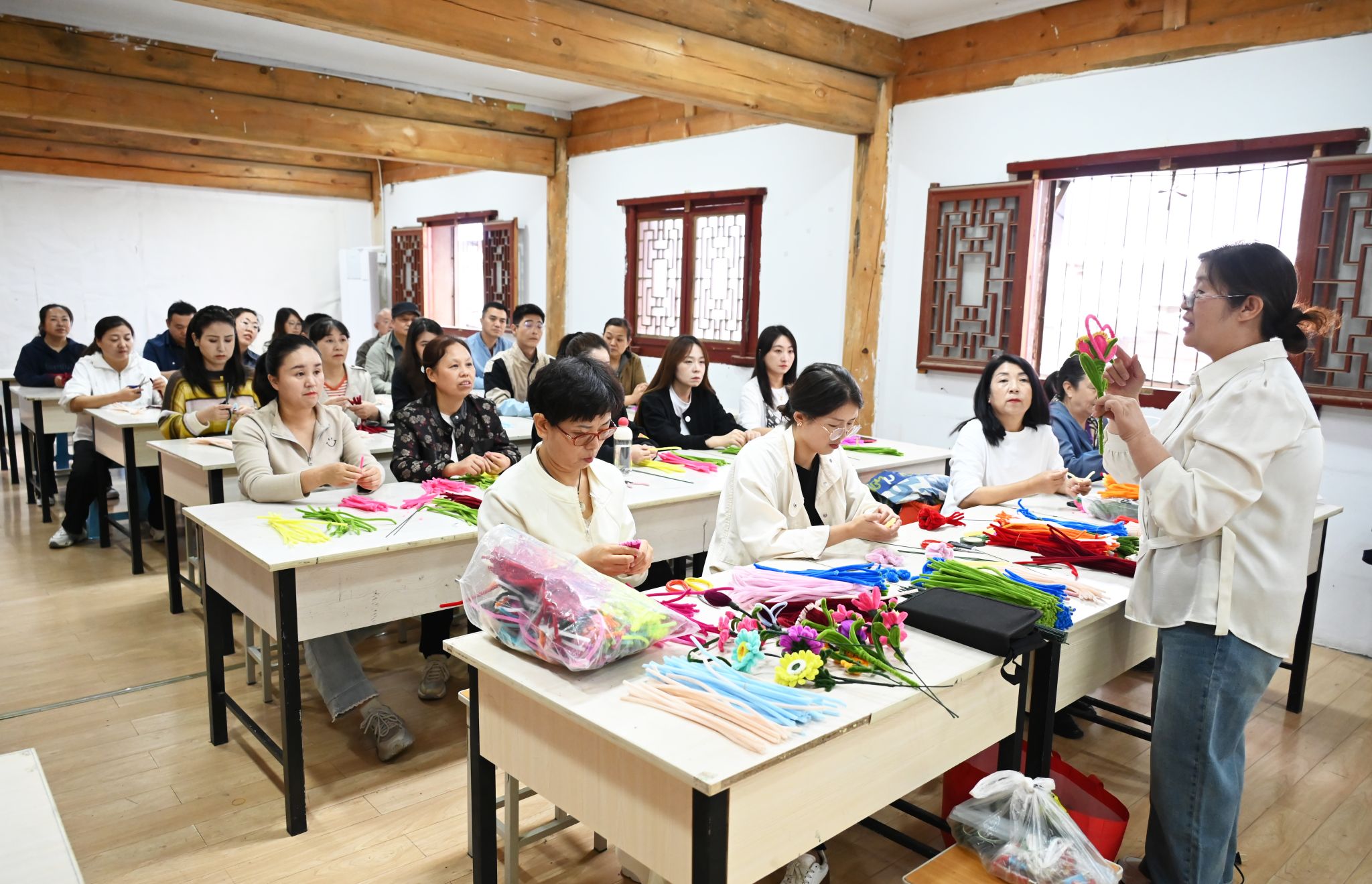 活动现场,洋溢着欢乐温馨的氛围。在绒花制作环节,绒花制作技艺传承人细致讲解绒花的历史渊源与制作技艺,每一位参与者认真聆听,仔细观察,随后迫不及待地动手尝试。从勾条、打尖到传花,每一个步骤都充满挑战,但大家相互交流、互相帮助,在欢声笑语中逐渐掌握了制作技巧。不一会儿,一朵朵色彩明艳、形态逼真、充满浪漫情调的爱心玫瑰在她们手中绽放。