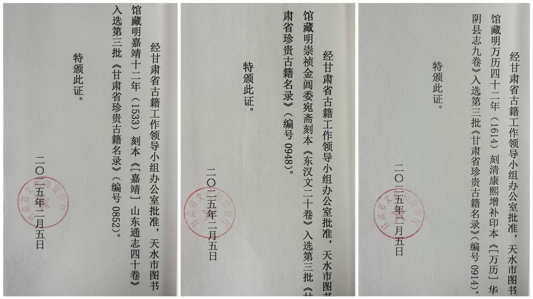 “斯文在兹,典籍为证。”本次入选的5部古籍版本特色鲜明,具有较高的历史文献与学术价值。它们的成功入选,不仅丰富了天水的文化宝藏,也为学界提供了重要的研究资料。此次入选,标志着我馆在古籍保护、整理与研究工作方面取得了又一实质性进展。至此,天水市图书馆入选甘肃省珍贵古籍名录的馆藏古籍已达32部,其中5部入选了国家珍贵古籍名录。这些历经岁月沧桑的文献,是中华文明绵延不断的重要实物见证,也是天水深厚历史文化底蕴的生动体现。