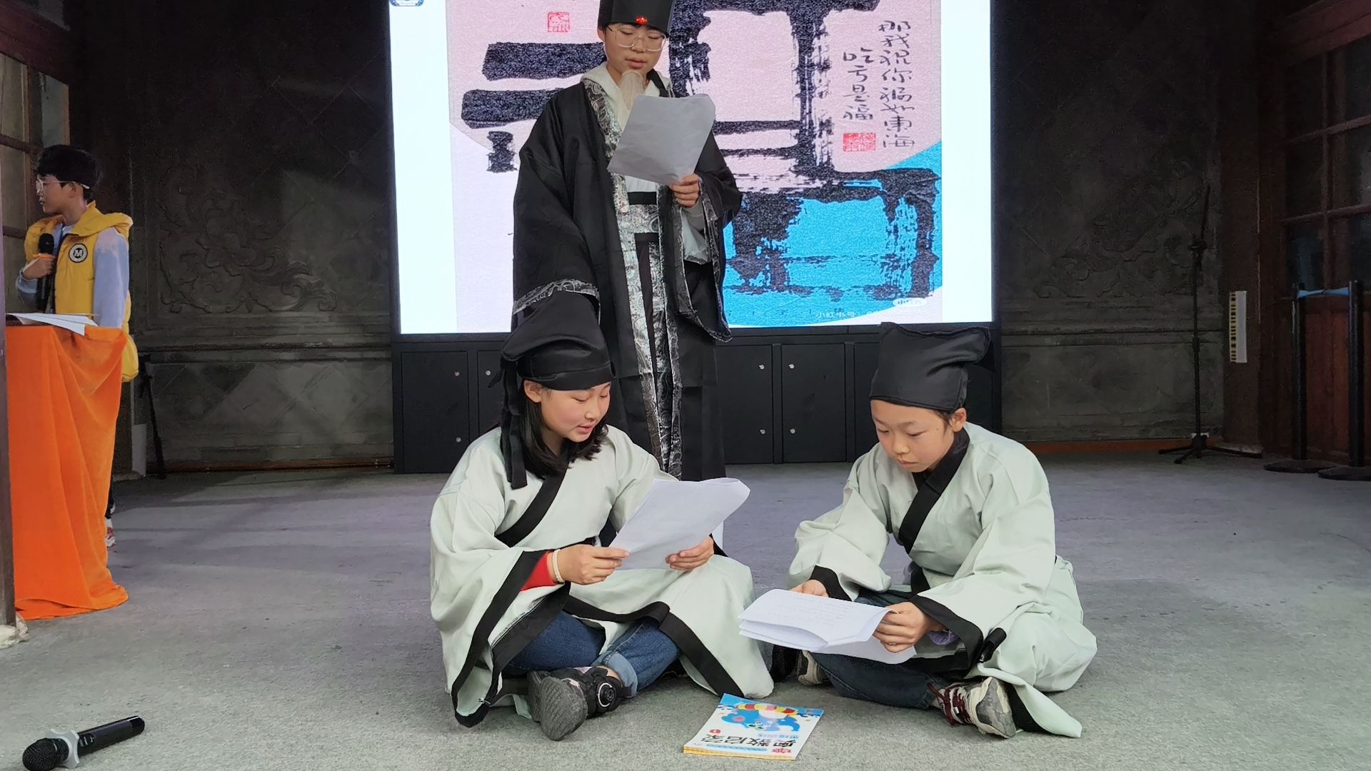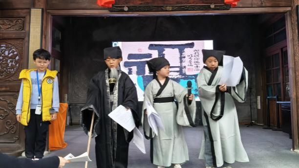 情景剧《吃亏是福》表演环节将活动推向高潮。青少年们分组上阵,每组3 名“小演员”分别扮演郑爷爷与两名吵架的小朋友。他们快速入戏,用鲜活的对话与动作,演绎出“因小事争吵”到“领悟吃亏是福”的转变。台下观众在笑声中共情,原本抽象的文化概念,瞬间变得具象可感。