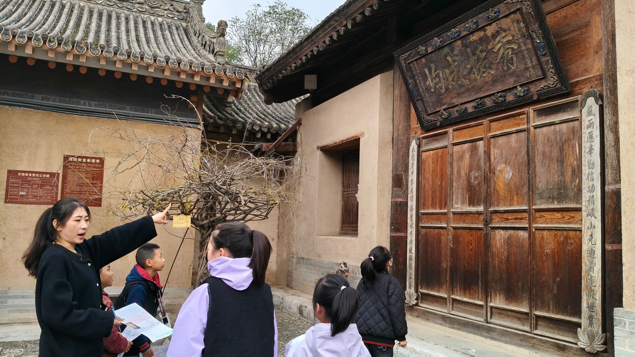 活动伊始,社教老师带领青少年走进院落逐一欣赏馆藏匾联,结合实物讲解其起源、形制分类与书写风格。孩子们近距离观察匾额与楹联上的笔墨痕迹,聆听背后的故事,在触手可及的文化载体中,悄然建立对匾联文化的初步认知。
