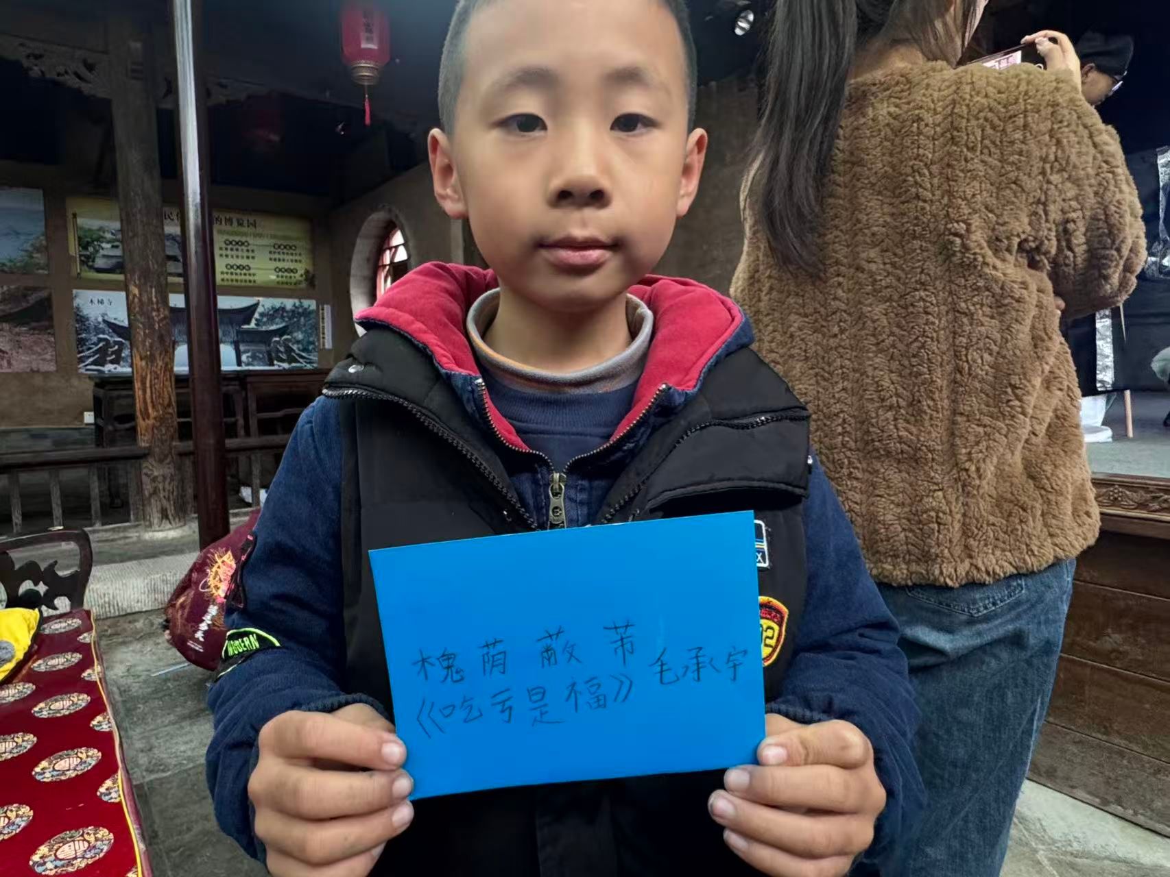 活动尾声,孩子们领取卡片与画笔,或写下“吃亏是福”“德润乡邻”等印象深刻的匾额文字,或创作专属短句,随后上台展示并分享选择初心,将文化收获沉淀为独特记忆。
