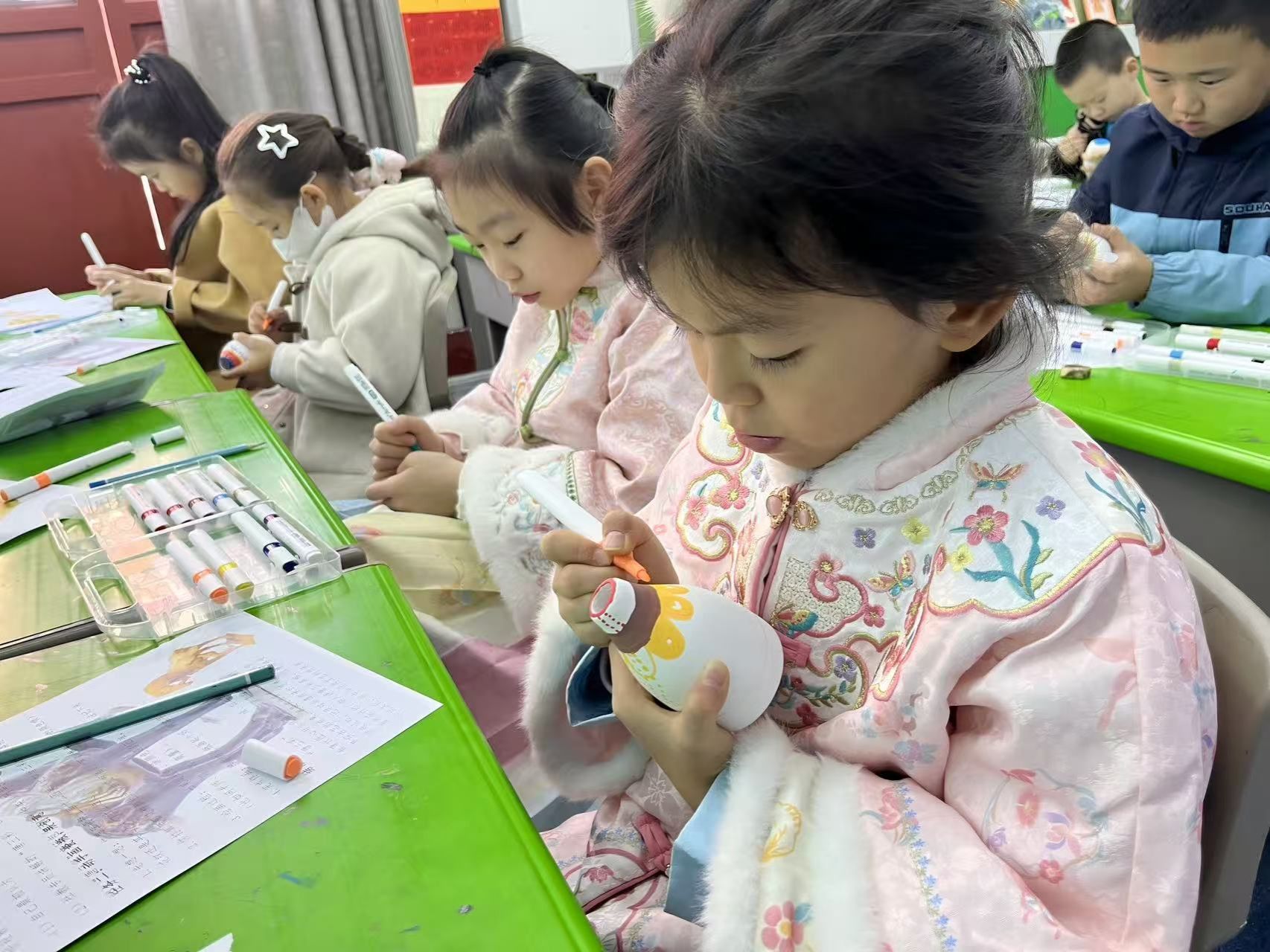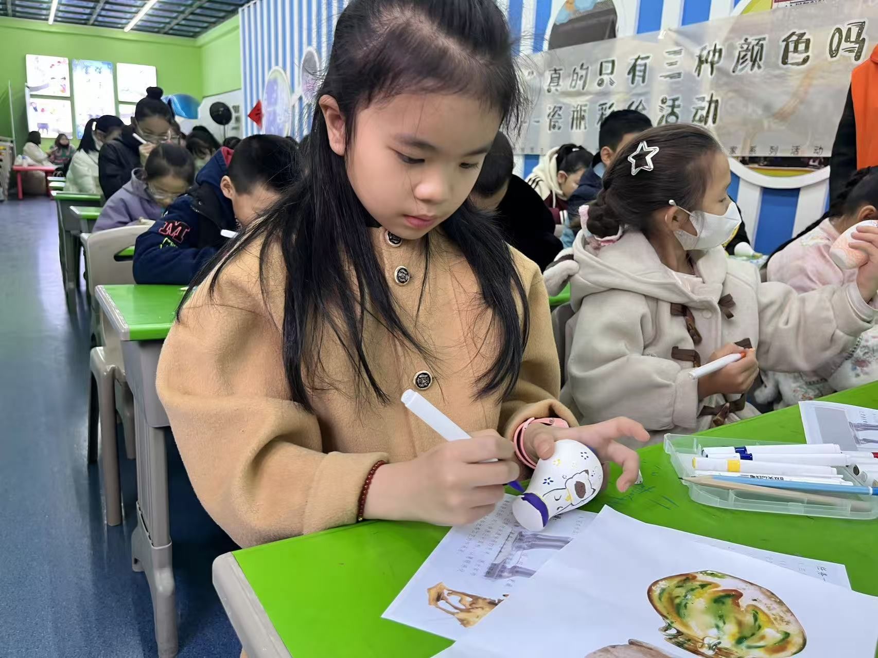 最后,“瓷瓶彩绘创作”环节拉开帷幕。在宣教老师的专业指导下,同学们手持环保釉料等工具,在白色瓷瓶上尽情创作——既有复刻传统三彩配色的经典呈现,也有大胆突破的创新尝试,沉浸式体验了手工制作的满满乐趣。