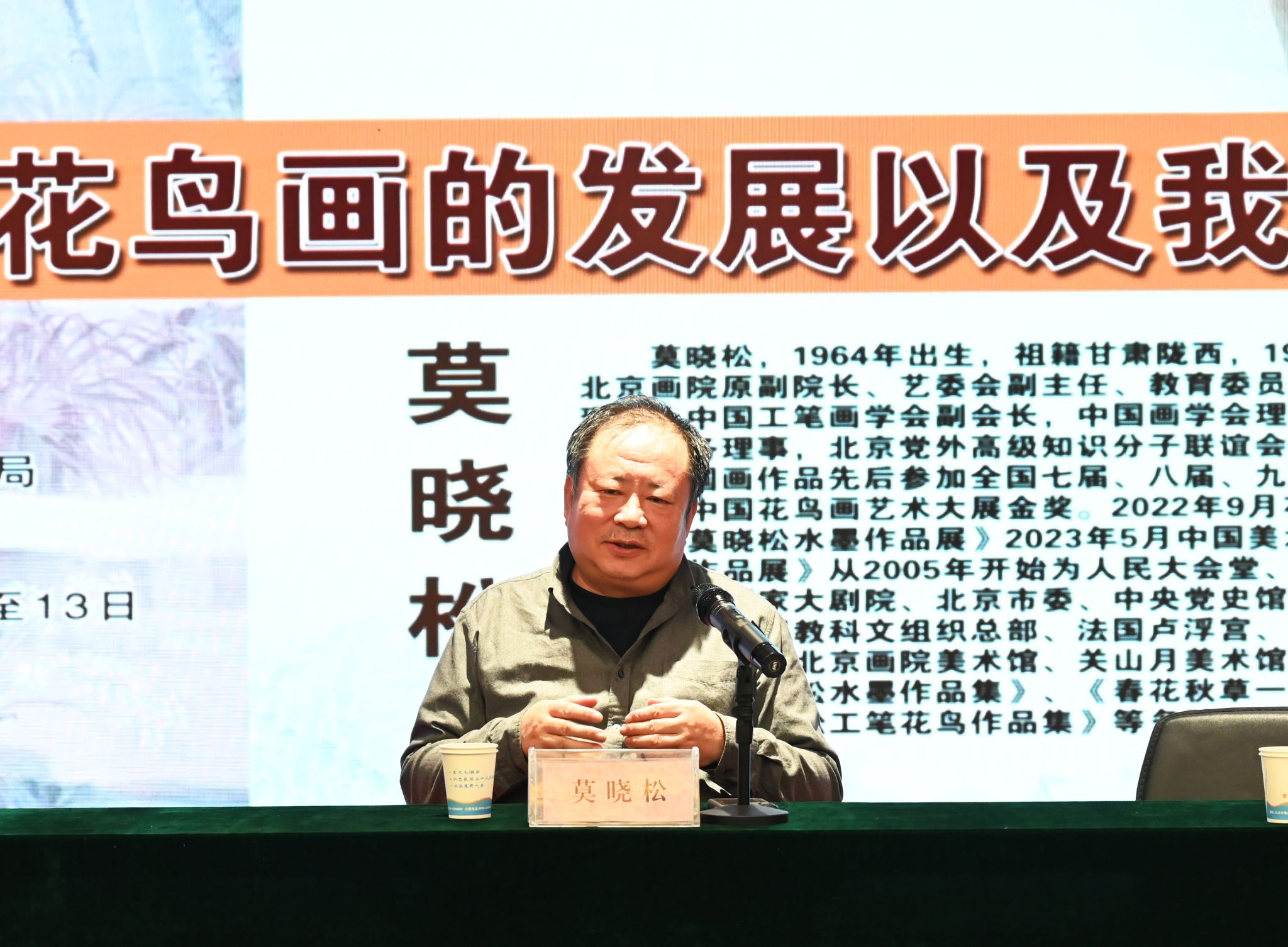 开班仪式结束后,莫晓松先生以一场题为 《当代工笔花鸟的发展以及我的创作经历》 的精彩讲座,为学员们上了第一课。他从中国美学的源流讲起,深入浅出地阐释了宋人花鸟中蕴含的“格物致知”精神与现代审美转换的可能,其深厚的学养和宏阔的艺术视野,瞬间点燃了全场学员的学习热情。