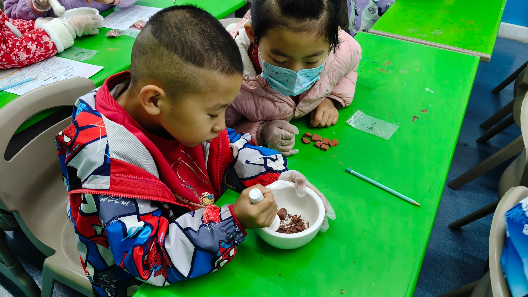 让孩子们兴奋的莫过于亲手制作矿物颜料的环节。大家拿起石臼、研磨杵,将原始的矿物块一点点研磨成细腻的粉末。看似简单的步骤,却极其考验耐心与技巧。在反复研磨、过筛、调胶的过程中,孩子们不仅体验了古人制作颜料的不易,也更深刻地体会到传统手工艺中所蕴含的专注与智慧。