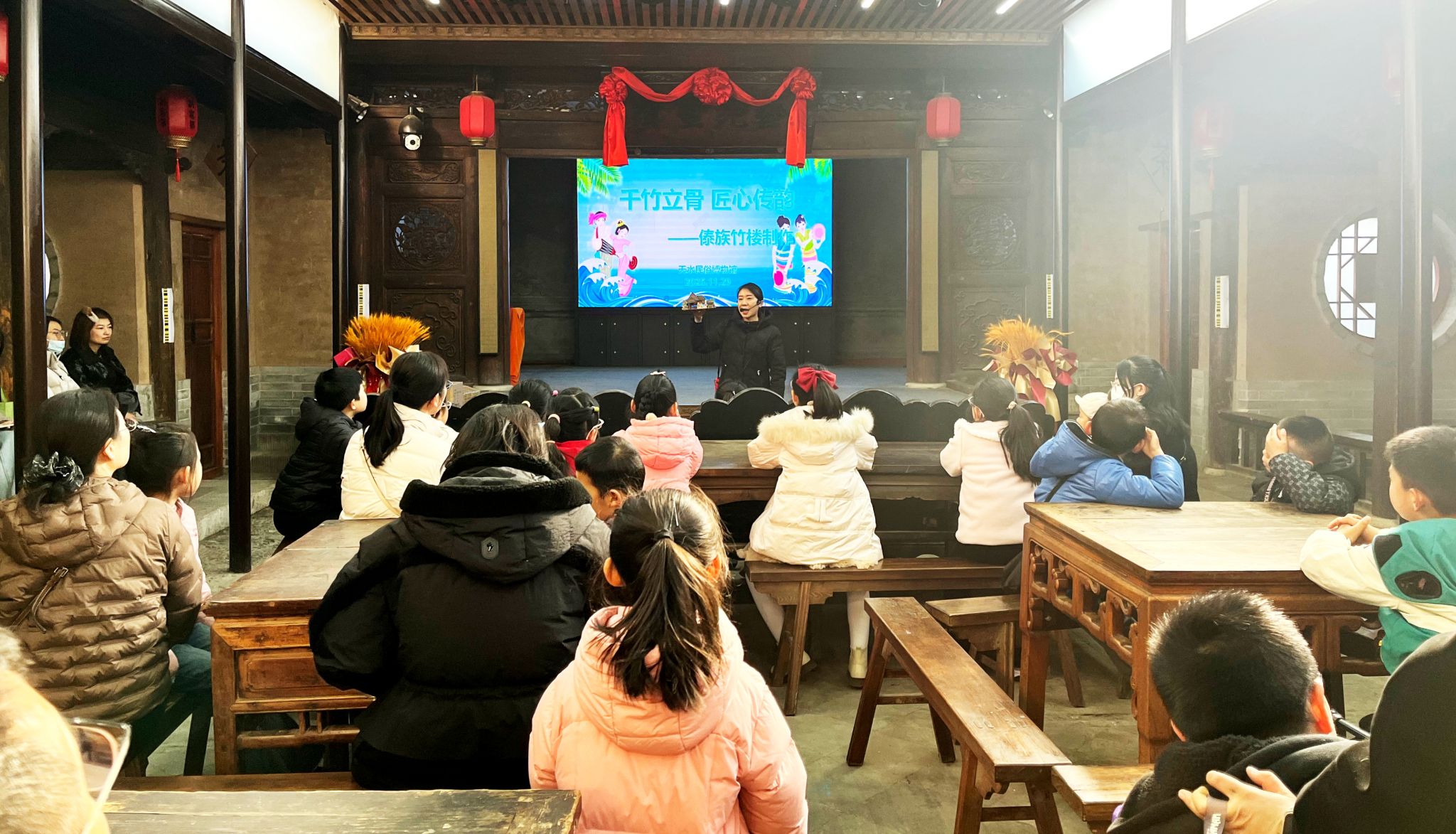 在中华文明的璀璨星河中,各民族建筑是凝结智慧与审美哲学的瑰宝。竹楼作为古老的干栏式建筑,既适配热带雨林的湿热气候,更是傣族“人与自然和谐共生”理念的生动载体。为配合天水民俗博物馆“柔情傣乡 水的民族——西双版纳傣族传统文化展”,让青少年深度了解傣族文化的独特魅力,11月29日下午,天水民俗博物馆举办“千竹立骨 匠心传韵——傣族竹楼制作”社会教育活动,我们邀请青少年在动手实践中,于榫卯交错间感受“生活在他乡”的诗意。