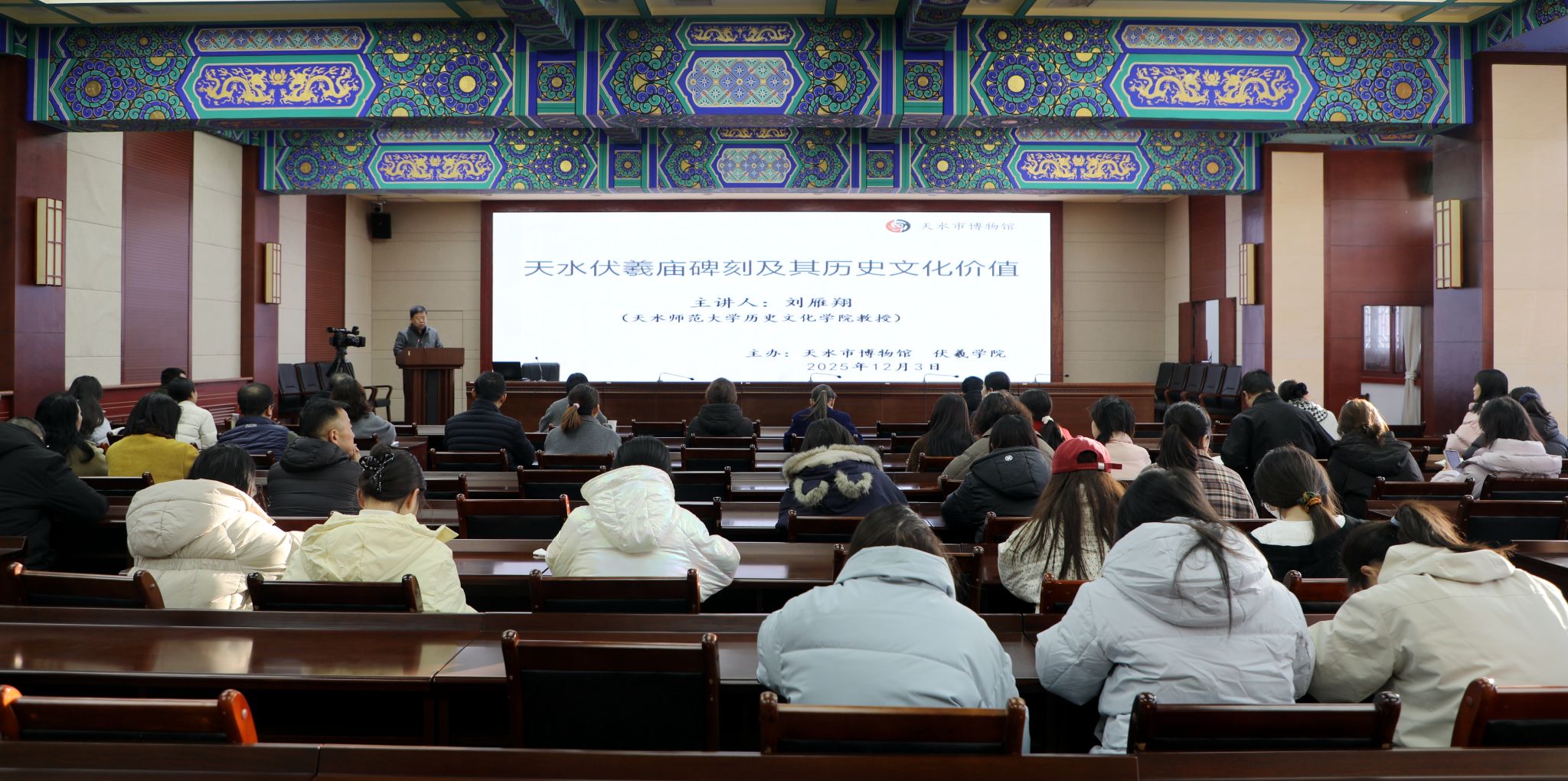 12月3日,天水市博物馆邀请天水师范大学教授刘雁翔作了题为《有石为证——天水伏羲庙碑刻及其历史文化价值》的学术讲座,讲座由天水市博物馆馆长刘玉璞主持,天水行业博物馆同仁、天水市博物馆干部职工、天水师范大学历史文化学院部分师生以及对天水地区石刻文化感兴趣的社会人士80余人聆听了讲座。