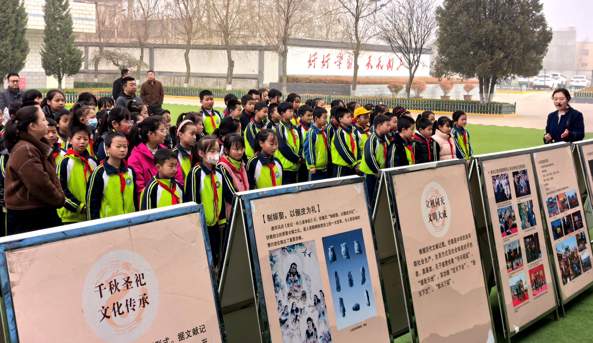 在平南镇中心小学,伏羲功绩展板有序陈列,宣讲老师围绕人文始祖伏羲功绩、一画开天与八卦智慧、中华根脉文化传承等内容,用通俗易懂的语言、生动鲜活的故事,向师生们系统讲解伏羲画八卦、结网罟、定嫁娶、创历法的文明开创之举,解读八卦符号中蕴含的天地规律与东方哲思。同学们驻足聆听、认真思考,在图文并茂的讲解中触摸文明源头,感受羲皇故里深厚的文化底蕴。