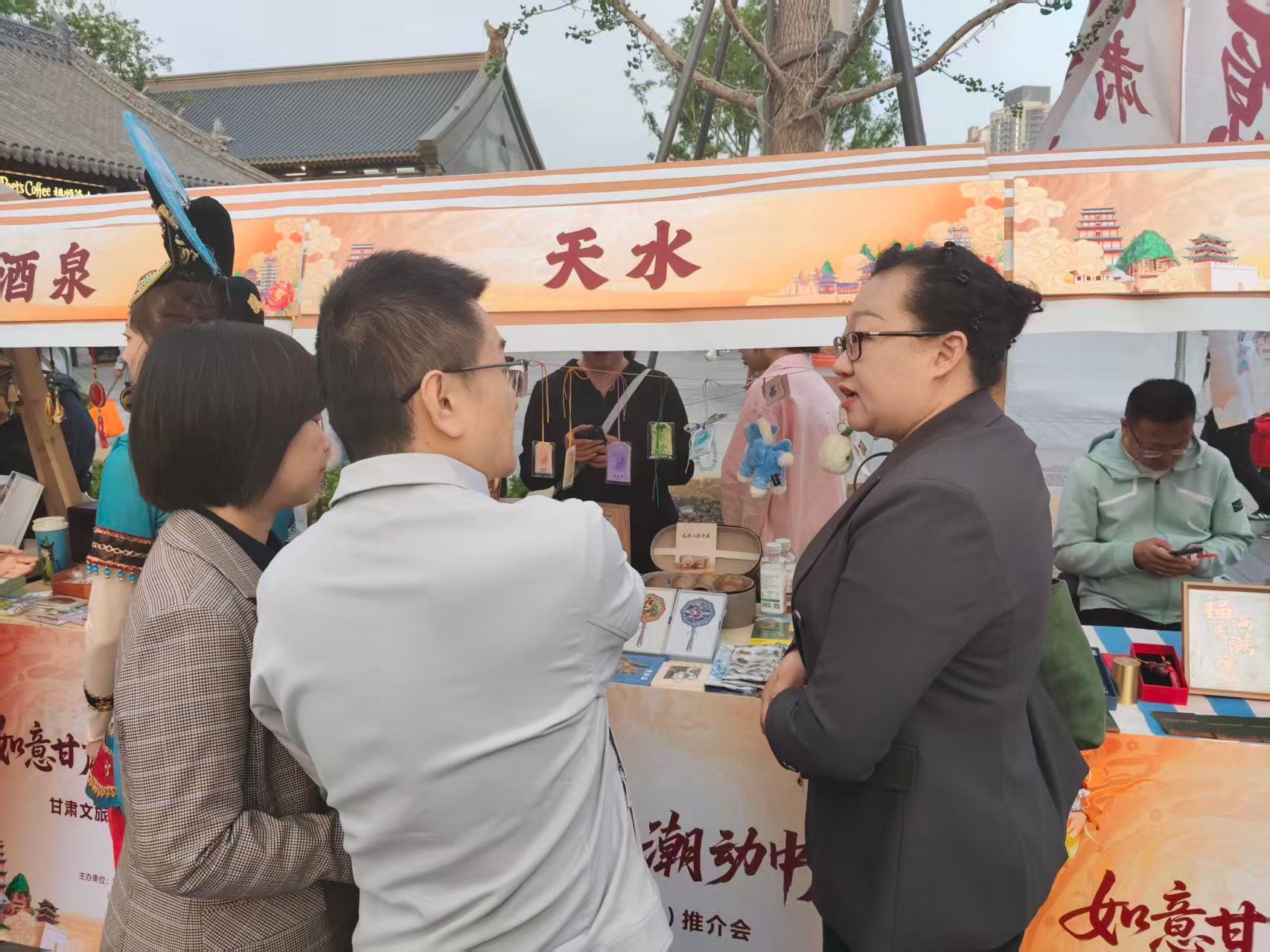 当晚,在郑州“亳都·新象”商业街区的甘肃文旅快闪活动,采用轻量化、沉浸式、强互动的快闪推介形式,将甘肃特色文旅资源零距离呈现给郑州市民。在展览展示区域,天水精心准备的团龙团凤纸雕灯、八卦龙图套杯、酥圈圈毛绒玩具、秦安脆瓜毛绒挂饰、益生菌酸菜等具有代表性的天水文创及美食产品,受到广大市民的青睐,纷纷前来围观购买。工作人员化身“文旅推介官”,热情的介绍天水特色文旅资源、产品,发放天水文旅宣传书籍、折页,吸引了众多游客驻足询问,热情参与美食品鉴。