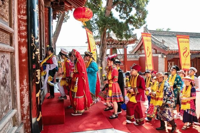 在甘肃天水举行的2023年公祭中华人文始祖伏羲大典上,各界人士代表进入伏羲庙先天殿献花。