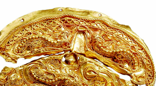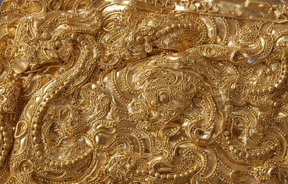 汉代掐丝焊珠七龙纹金带扣边饰和掐丝焊珠工艺特写