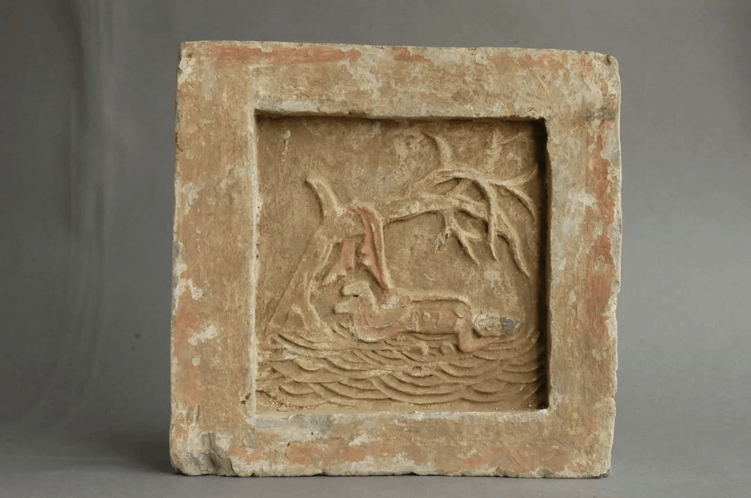 该砖长31cm,宽30cm,厚6cm,征集。边微凸,中凹面高浮雕一枯树,一男子裸体侧卧于冰面上,衣衫挂于树上,波纹中两鱼头露出,为“王祥卧冰”人物故事。 王祥是东汉未西晋初期山东临沂人。他父王融是个隐土,母亲早年去世,父亲又娶朱氏为妻,朱氏不喜欢王样,经常说王祥的不是,时日久了,父亲也不喜欢王祥了。王祥每日干又脏又累的活,尽管如此,父母生病后,王祥昼夜守护在他们身边,但朱氏还是很讨厌他。一个寒冷的冬天,朱氏突然要吃活鱼,让王祥去有捞,他到河边,河面结冰,怎能捕到鱼。他走到冰面,脱下衣服赤体卧在冰上,想用体温融化坚冰,突然冰裂成缝,两条鲤鱼跃出水面,他拎着两条鲤鱼高高兴兴地回了家。