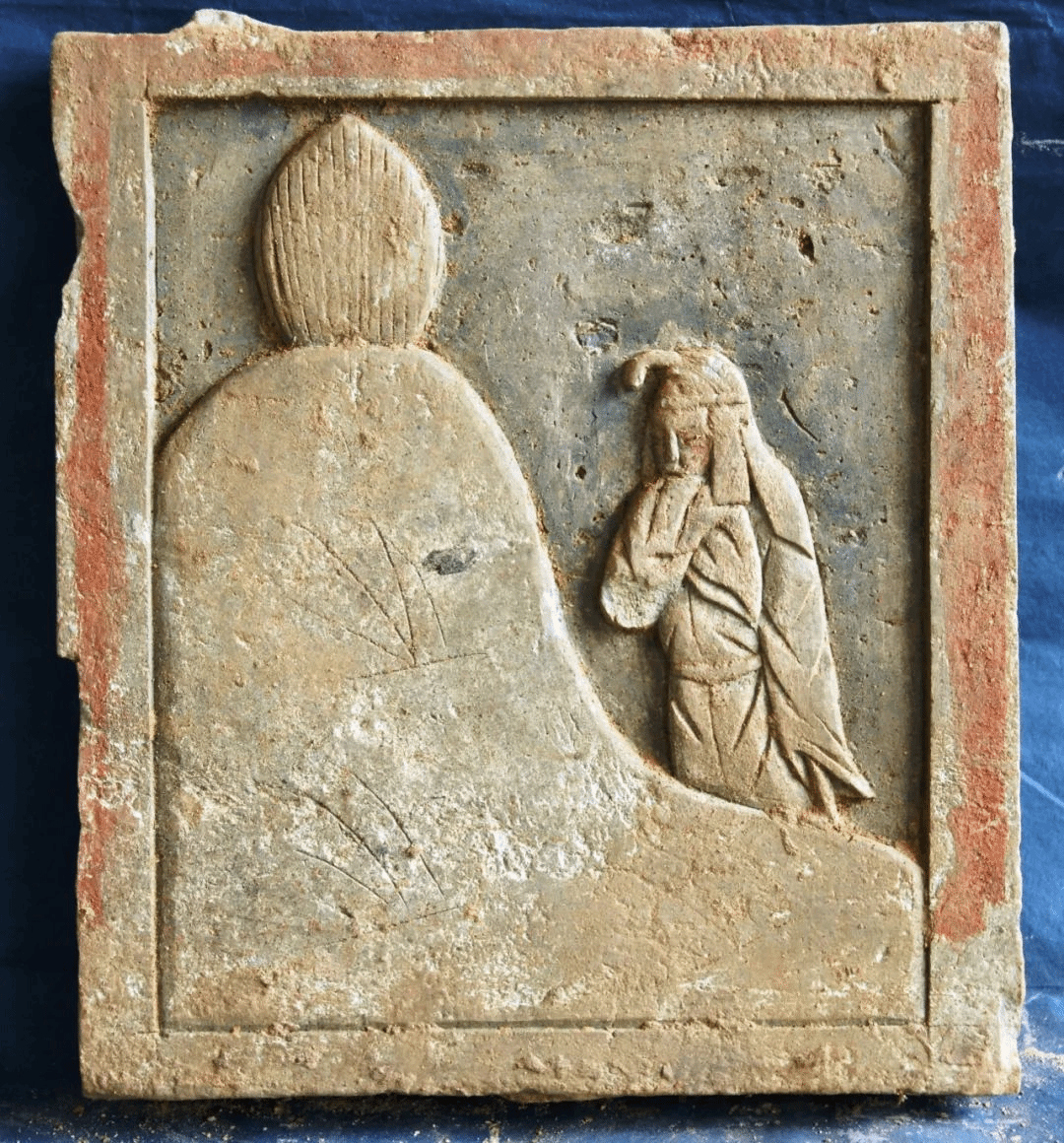 该砖长33cm,宽29cm,王河上牟宋墓出土。砖面上高浮雕一身着孝服的男子跪于坟墓前,掩面哭泣。 王裒是三国末期魏国司马昭下属的军事参谋王仪的儿子,其父因说话得罪了司马昭而被斩首示众。王裒长大后认为父亲死的冤枉,对朝廷非常不满,当时已为西晋,王裒连坐都不面向西方,以示不做西晋的臣子。王裒博览群书,才能非凡,一直隐居民间以教书为生,因怀念父亲对朝廷的招聘毫不动心,还在父亲墓边建一草屋,每日早晚在墓前跪拜,常常在墓前啕声大哭。后来母亲也去世了,母亲生前最怕天上打雷,只要听到打雷声,王裒就急忙跪到母亲墓前安慰母亲不要害怕,有儿陪着你。西晋末期,家乡盗贼横行,附近人家都离家逃难,惟独王裒不忍丢下父母的遗坟,结果被盗贼杀害。