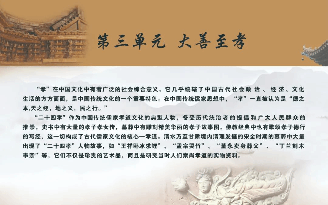 二十四孝传故事在清水乃至甘肃宋墓中大量出现。究其原因,当与宋代高度发达的理学有关。孝悌观念一直是儒家伦理道德的核心,历代统治者也把提倡孝道孝行作为立身教民之本、安邦治国之基,不断旌表褒奖孝子,为之立传。“孝道”作为儒家文化修身、治国之本,在宋代理学中仍居核心地位。宋代理学的主要宗旨是维护中央集权统治和礼仪纲纪伦理,在这种政治文化氛围中,墓葬作为反映现实生活的重要场所,大量雕绘孝子事迹图,一方面反映了墓主人生活时代的精神文化面貌,另一方面表现了墓主人生前尽孝行道的生活以及希冀后代子孙行孝积善、以获福报的强烈愿望。